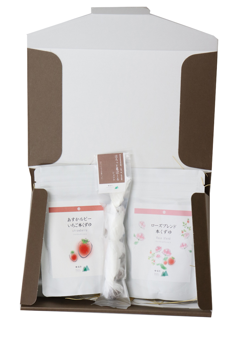 | 原材料 | ローズブレンド本くずゆ:てんさい糖(北海道産)、本葛(奈良県産)、ローズペタル、ローズヒップ、いちご あすかルビーいちご本くずゆ:砂糖(てんさい糖)、本葛(奈良県産)、いちご(あすかルビー(奈良県産))米粉(奈良県産) ほろっと葛ぼーる(ショコラ):アーモンドパウダー、本葛粉(奈良県産)、こめ油(国産)、きび砂糖、有機ココア |