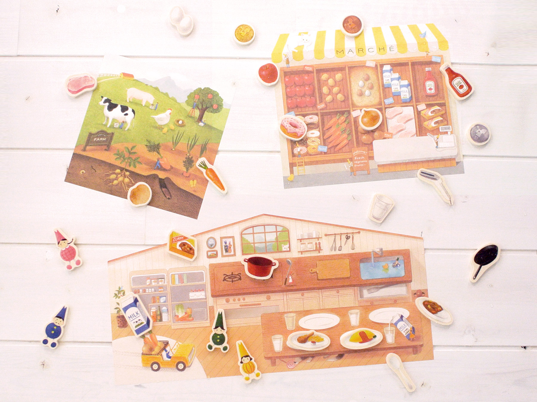 | パッケージ内同梱物 | ●ポスター(PP):3種(牧場・お店・おうち) ●パーツ(EVA):26種 ●お片づけ収納ネット袋(コットン) ●あそび方リーフレット |