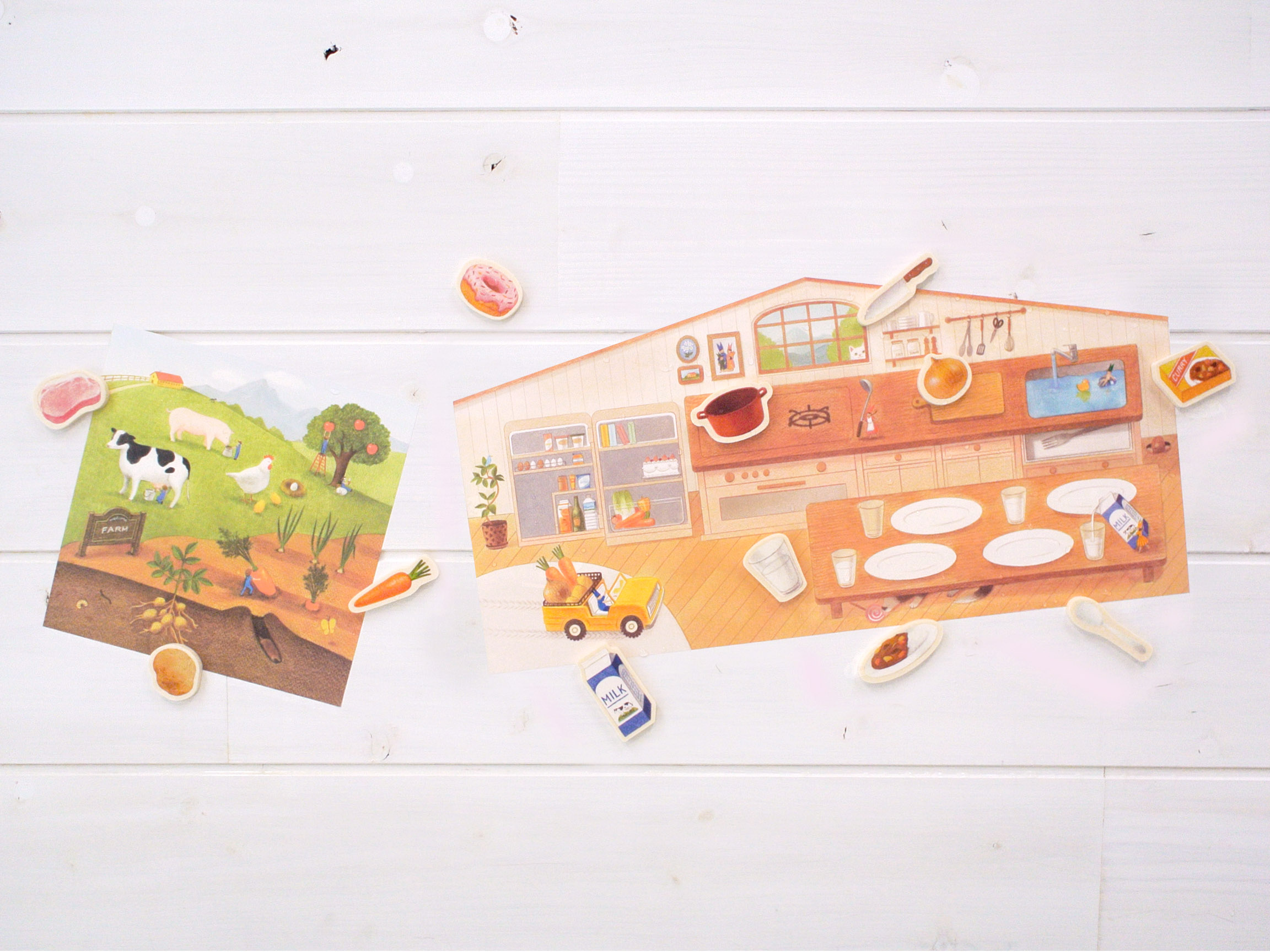 | 商品本体サイズ | ●ポスター(PP):2種 牧場 幅240×高さ240mm おうち 幅530×高さ265mm ●パーツ(EVA):11種 幅26〜80mm×高さ33〜80mm×奥行10mm ●お片づけ収納ネット袋(コットン):幅290mm×高さ345mm |