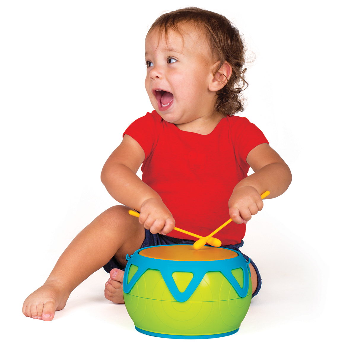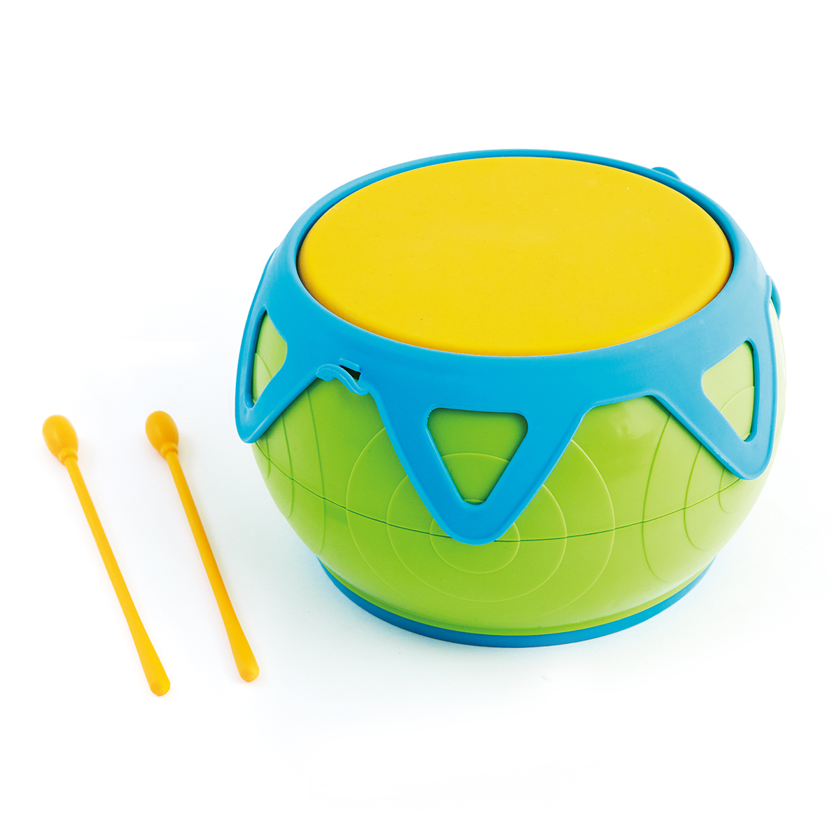 大口注文・法人のお問い合わせはこちら音階のないドラムは、いろいろな歌や楽器に合わせて音遊びが楽しめます。 打面はシリコン製のためやわらかい音が鳴り、まだ力加減が難しい1歳ごろのお子さまが力いっぱい叩いても大きな音が出にくいつくりです。 好きな音楽に合わせて、リズム遊び・からだ遊びを楽しみましょう。 ドラムを叩く動作は、目で見たとおりに手を動かすという目と手の協応運動にも役立ちます。 対象年齢:1歳半頃~
