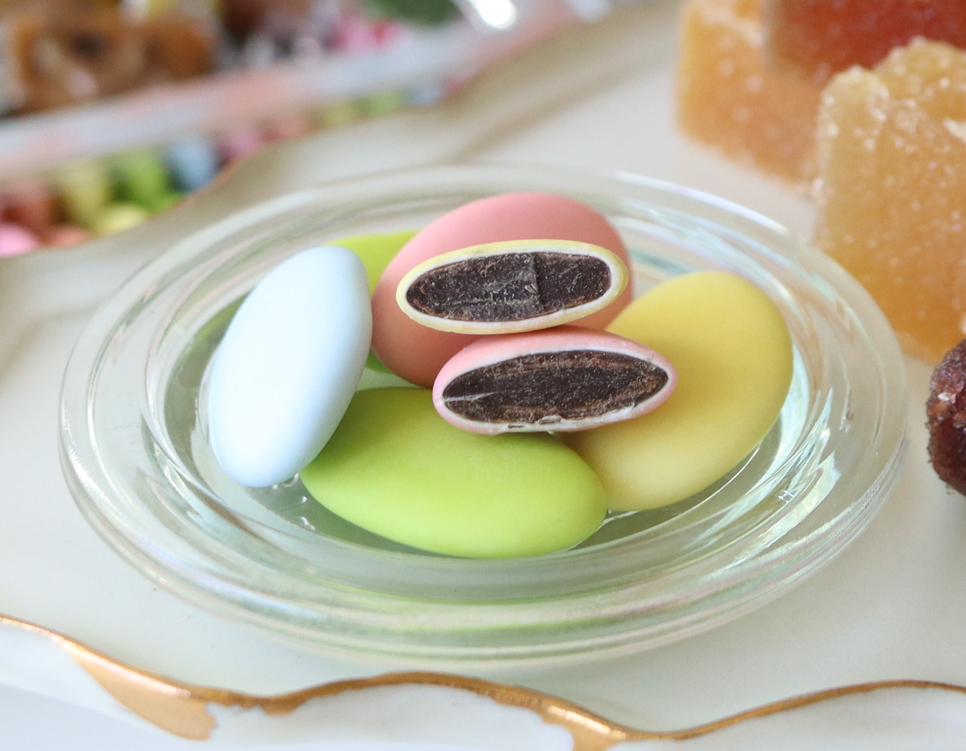 甘さを控えたチョコレートの表面に砂糖コーティングしてつくられたお菓子。 外側はカリっとした歯ごたえが特徴で、コーヒーや紅茶など、ティータイムのお供にお楽しみいただけます! 楕円形(パステル5色):ダークチョコレート(カカオ54%)