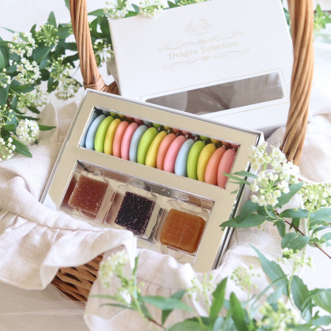 大口注文・法人のお問い合わせはこちらヨーロッパでは紀元前170 年代後半より貴族の間で婚礼や出産などの慶事に祝い菓子として使用されておりフランス語で「幸福の種」という意味もあるドラジェ。 同じくヨーロッパで「お菓子の宝石」と称され、厳選したフルーツの果実を1粒1粒に凝縮してつくられた、フランスでは10世紀からの伝統菓子パート・ドゥ・フリュイ(フルーツゼリー)。 高級感のあるホワイトのパッケージに、フランス産のこだわりスイーツ2種を贅沢に詰め合わせたギフトは、日頃の「ありがとう」を伝える母の日のプレゼントにもぴったりです。 期間限定で『Happy Mother's Day』のメッセージ帯熨斗付きでお届けします。
