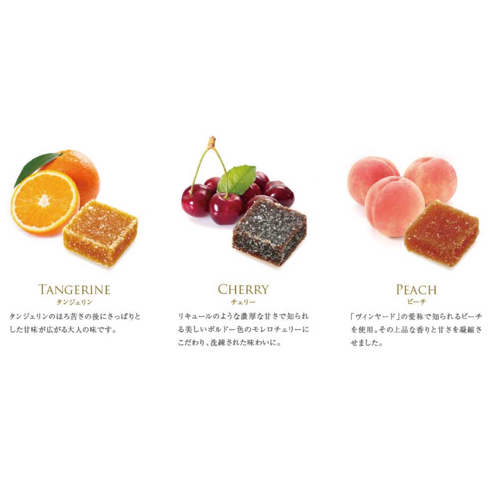 フルーツの甘みや酸味をバランスよく凝縮!紅茶やコーヒーなどティータイムや、ワイン、シャンパンのアルコールのお供にもぴったり。 ▼人気のフレーバー3種を各1粒(合計3粒)お詰めしています タンジェリン、チェリー、ピーチ