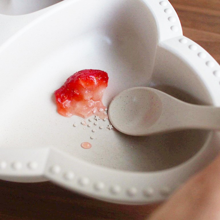セットのスプーンに合わせ、すくいやすいようにコーナーを曲線にしました。 星型の突起は食材をすりつぶすことができます。 3cmの深さがあるワンプレートで、スープやカレーなどの水分が多い料理も入れられます。 表面と裏のつぶつぶは滑り止めの役割があります。