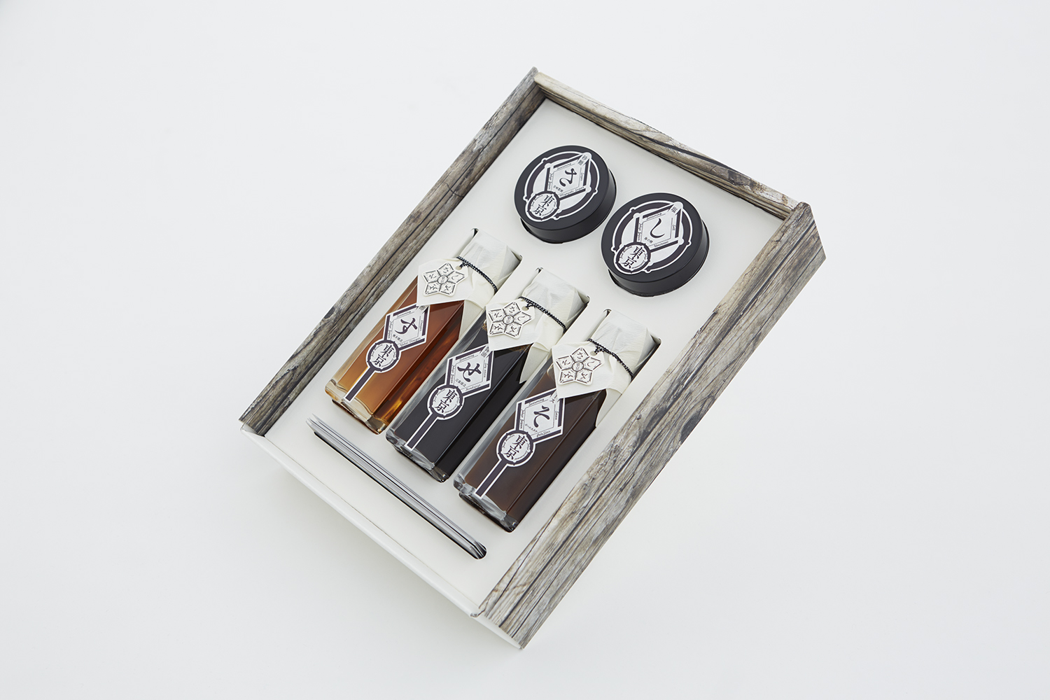 瓶詰め、パッケージ組み立て工程、ラベルなど全ての工程を手作業で行なっており、繊細できめ細やかな作業は世界に誇れる事を裏メッセージとしています。 パッケージのサイドが木の皮のようなデザインで、非常にクオリティが高いと評判です。調味料を使用した後にも飾っていただけます。