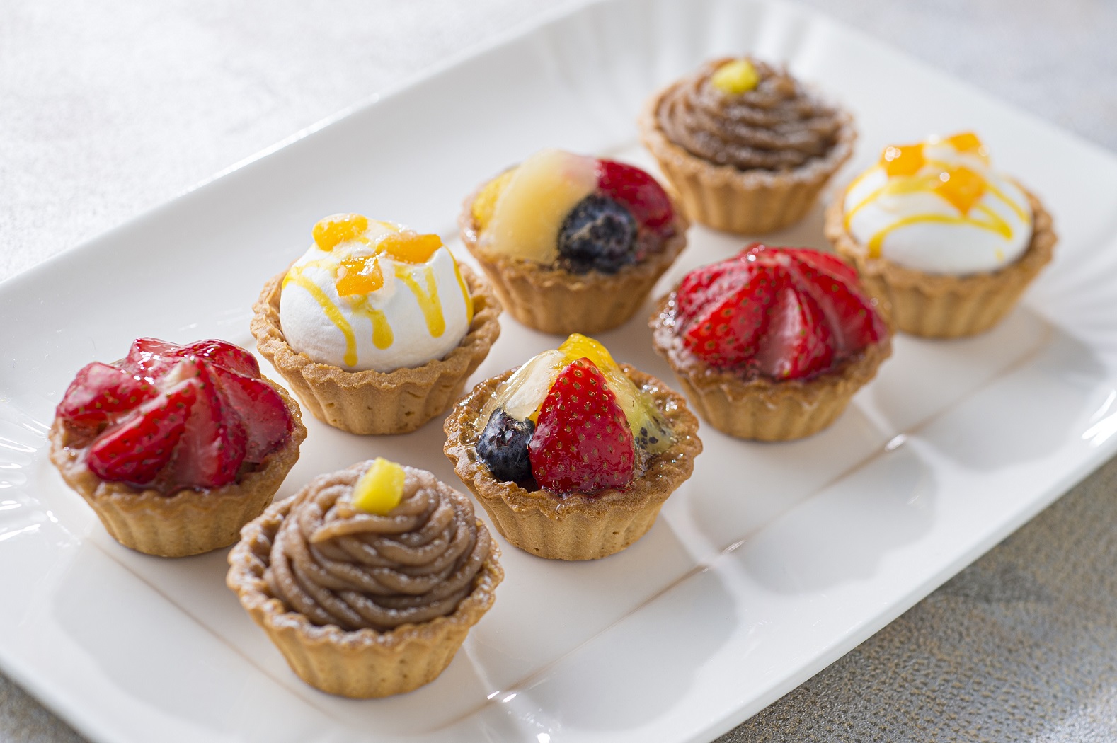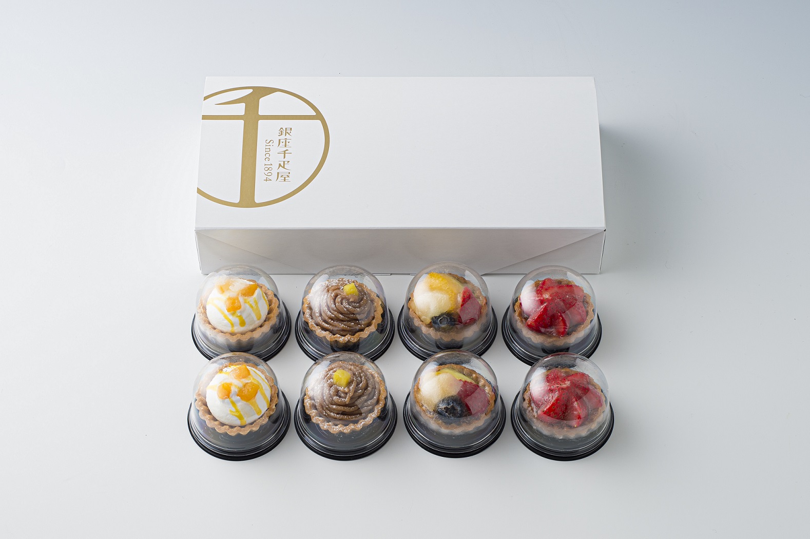 手のひらサイズのタルトに甘さ控えめのクリームやムース、色とりどりのフルーツを飾った【銀座千疋屋】オリジナルのフルーツタルト詰合せです。