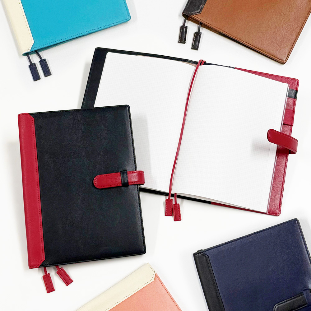 大口注文・法人のお問い合わせはこちらビジネスシーンでも “本革×カラー” で おしゃれを楽しめる、A5サイズの手帳カバーになります。 お気に入りの手帳やノートに装着して、重厚な1冊に。 そして、「できる大人」の印象に―――― どんなメーカーの手帳の レイアウトやサイズがお好みかは人それぞれです。 中身が気に入っていても、元々のカバーの色や素材が気に入らない場合がありますよね。 そんなときにも、着せ替え用のカバーとしておすすめです。