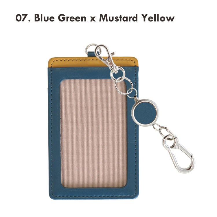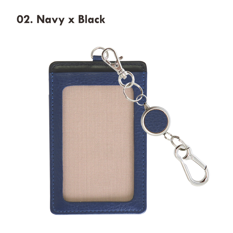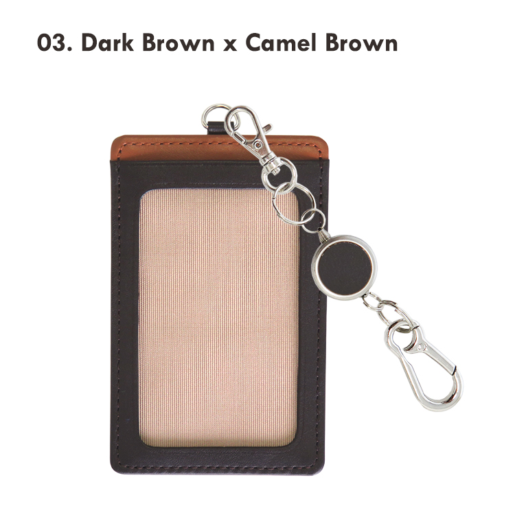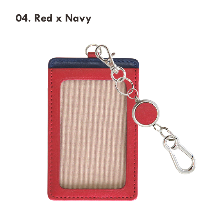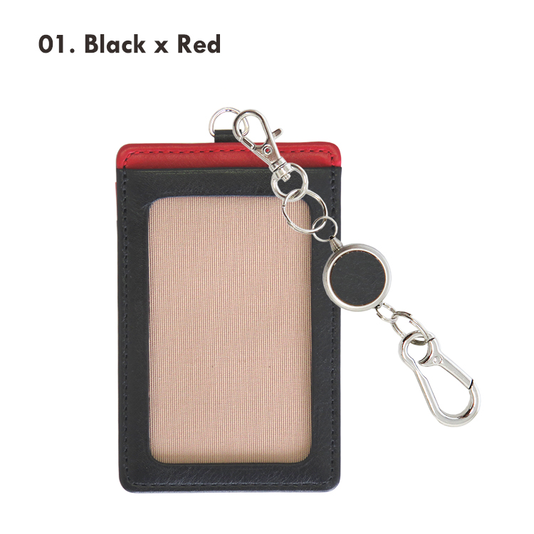 リール付きカラビナキーホルダーの本革製パスケース(縦型)です。 リール付きカラビナキーホルダーで、バッグにつけたままリールを伸ばしてスムーズタッチが可能。交通系ICカードを入れて定期入れとして、またセキュリティーカードを入れて入館・入室パスケースとしても。