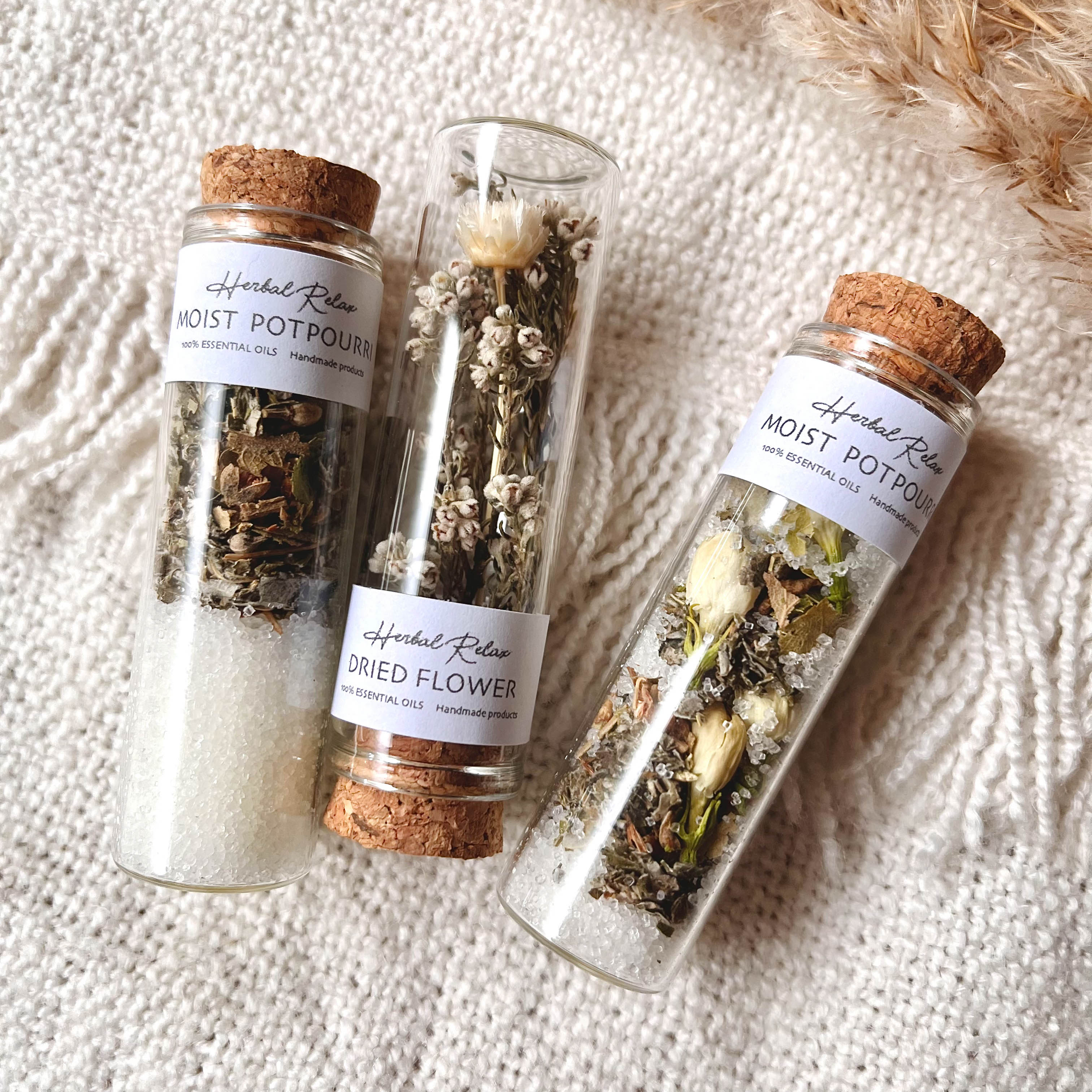 | パッケージ内同梱物 | ・モイストポプリ(瓶)*2 ・ドライフラワー(瓶)*1 ・アロマ精油名記載の台紙 ・モイストポプリについての説明書 |