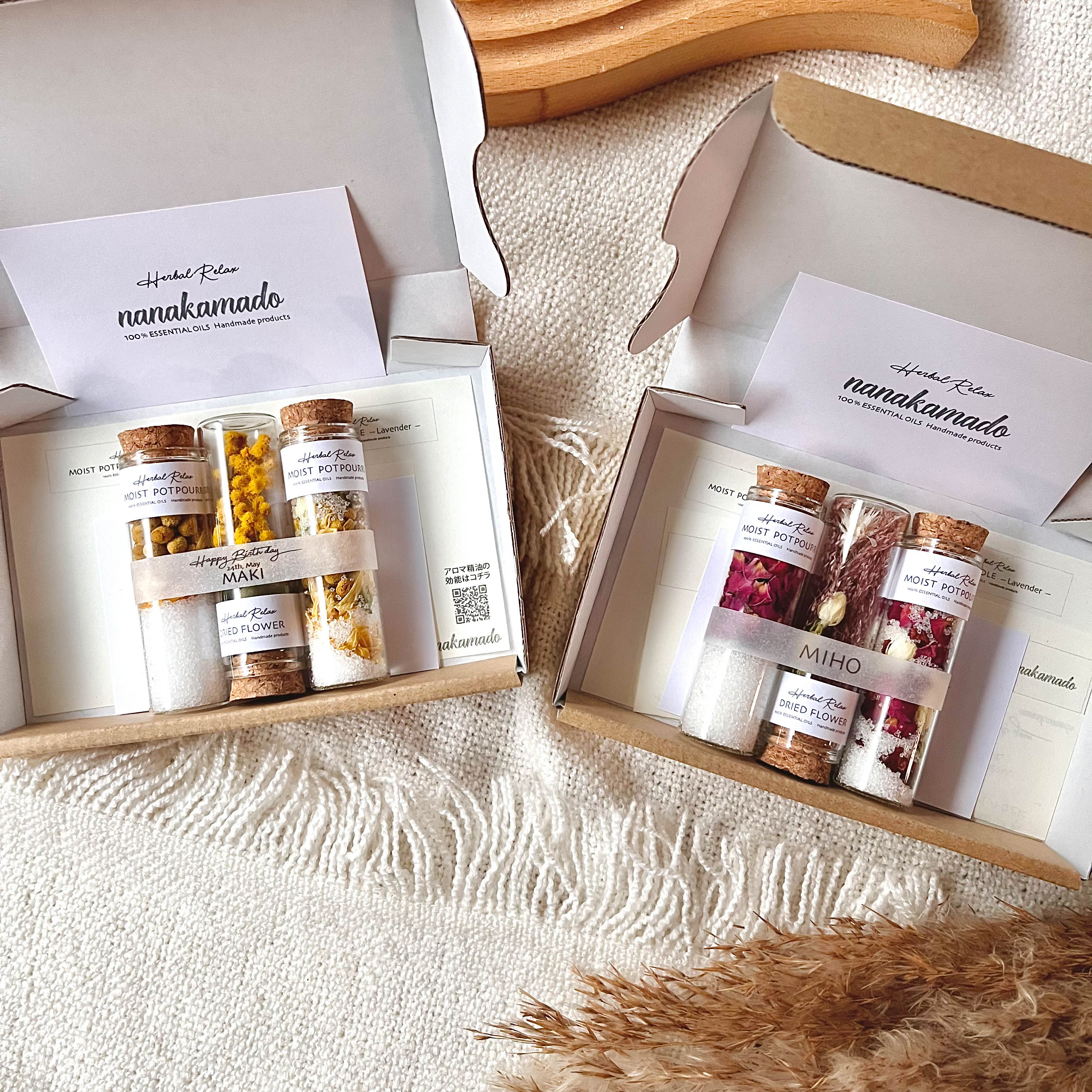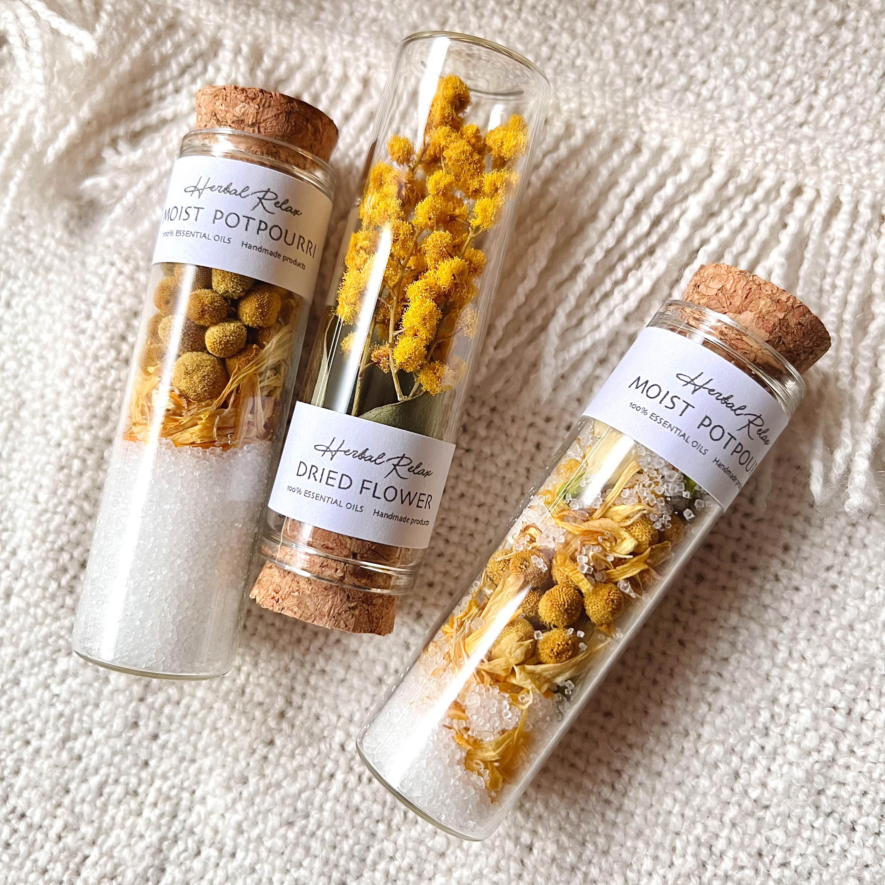 大口注文・法人のお問い合わせはこちらスペイン産のシーソルトの中に、アロマ精油とドライフラワーを詰め込んだ《モイストポプリ》2つと《ドライフラワー》1つをセットにしました。 シーソルトと精油、カモミール・マリーゴールドをブレンドし、ジャスミンのドライフラワーを詰め込みました。お花やハーブ(ドライフラワー)の選定からすべて手作業で行っているため、同じものはひとつとない、""あなただけのモイストポプリ""になります。