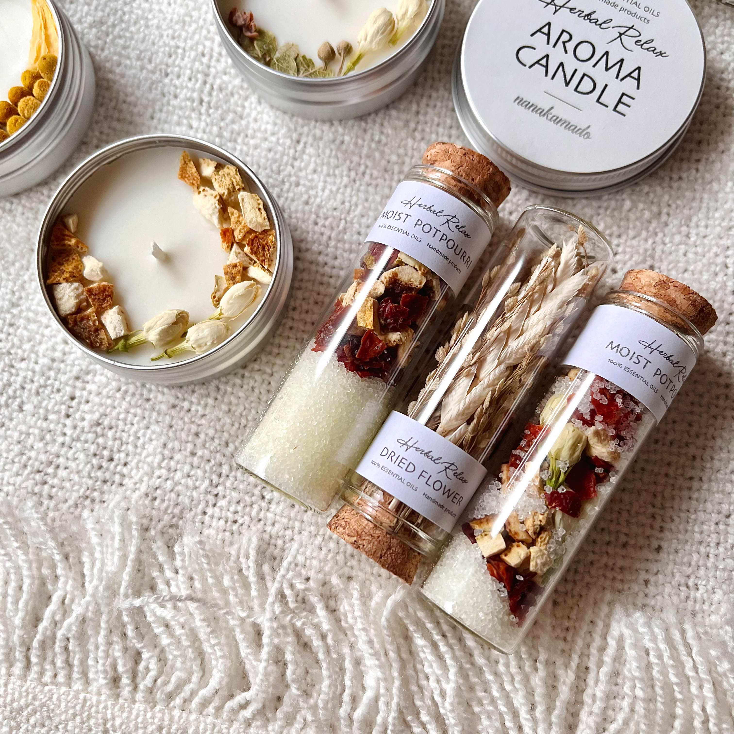 厳選され丁寧に作られた《モイストポプリ》《ドライフラワー》《アロマキャンドル》をセットにしました。