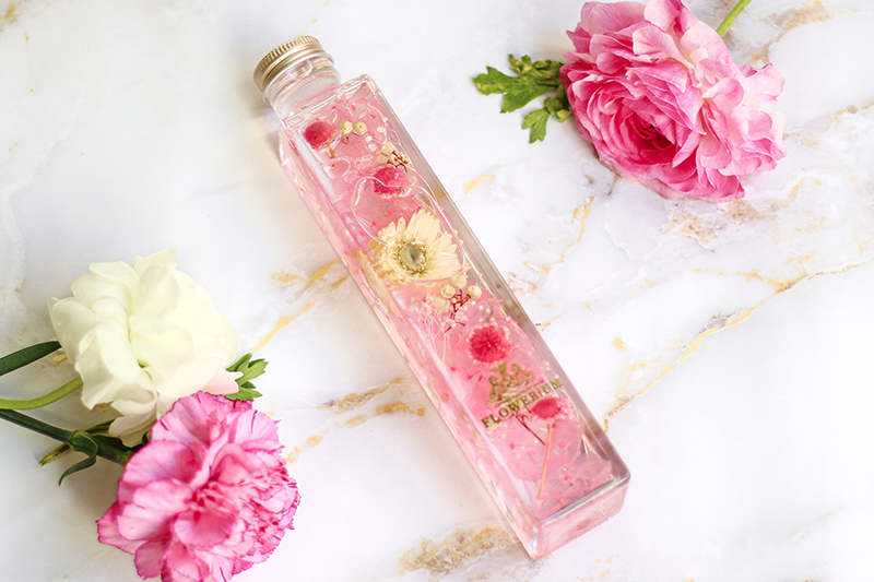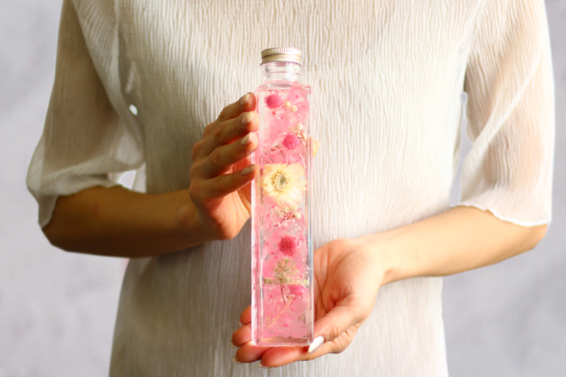 スリムでシャープなフォルムの”toilette(トワレ)”、 色や形が異なる季節の花々が使われているため同じものは二つとない、どれも世界にたった一つだけの作品です。 ボトルを上下にひっくり返したり、傾けたりすればガラスの中では花たちがゆっくりと優しく揺れ動き、 光が通過する度に葉脈が透き通りキラキラと輝く花弁にはこれまでに見たことの無い幻想的な世界が映し出されます。