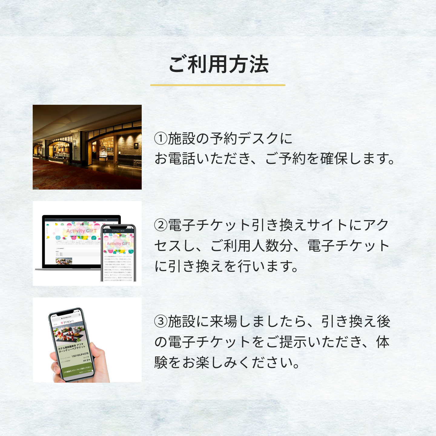 お好きな施設に電話で予約をしたのち、電子チケット引き換えサイトにて人数分の電子チケットに引き換え。 当日は電子チケットをご提示いただくだけで贅沢なアフタヌーンティーをお楽しみいただけます!
