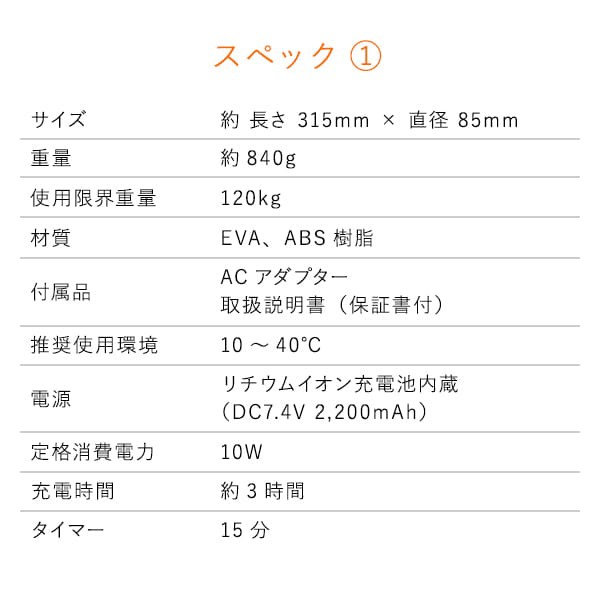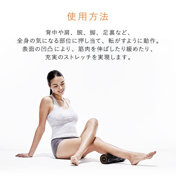 | 使用上の注意点・使用方法 | 背中や肩、腕、脚、足裏など、全身の気になる部位に押し当て、転がすように動作。表面の凹凸と振動により、筋肉を伸ばしたり緩めたり、充実のストレッチを実現します。また、本商品は当てるだけでも心地よくご使用いただけます。 |