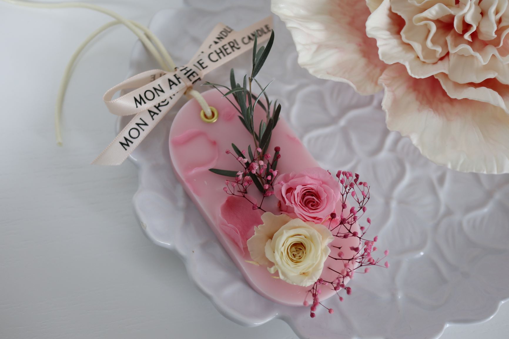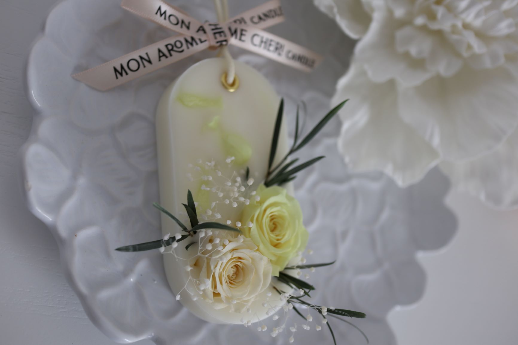 プリザーブドフワラーをほどこしたアロマサシェです。天然由来のワックスである大豆のワックス(ソイワックス)と蜜蝋(ビーズワックス)のみで出来ているため、オリジナルブレンドの香りを楽しみながら、消臭・空気清浄効果も期待できます。