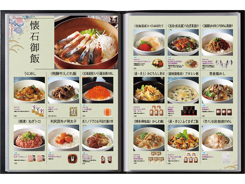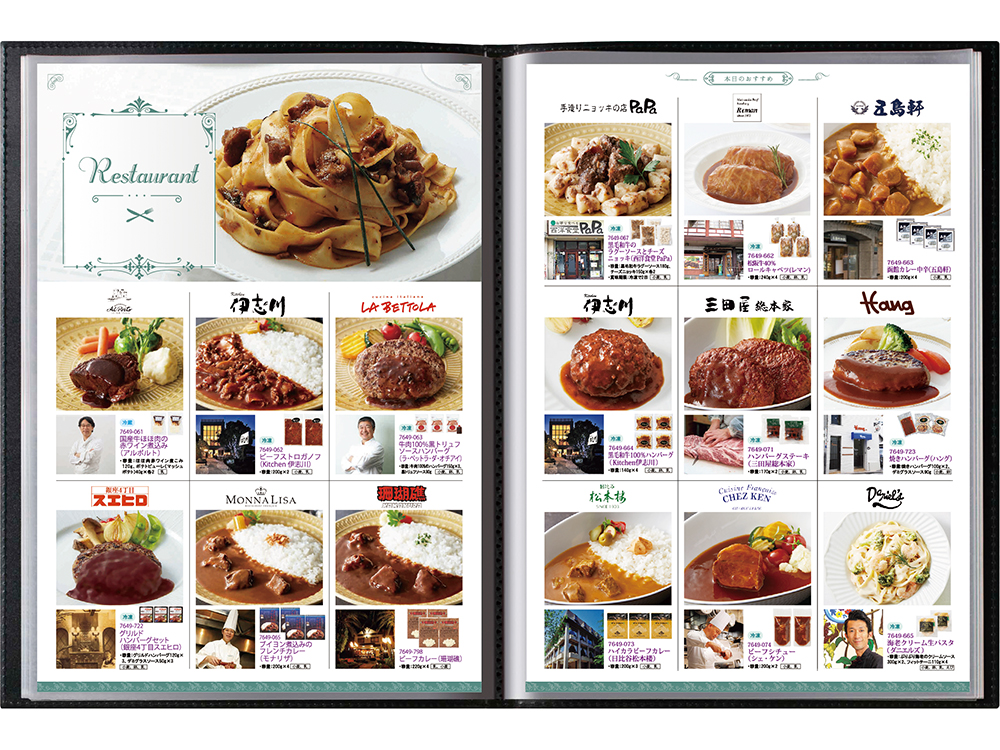 大口注文・法人のお問い合わせはこちら自宅に居ながら贅沢な食事の時間をお楽しみいただけるこだわりのグルメが選べるカタログギフトになります。 レストランのメニュー表のような高級感のあるファイルに入れて贈る「おうちレストラン」の豊富なグルメラインナップの中には「郷土の逸品」や「海産おつまみ」、「スイーツブランチメニュー」など、 厳選された自慢のグルメが顔をそろえ、先様の食事の時間を彩ります。 選べるグルメをレストランのメニューブックのようなファイルに包んでお贈りしませんか。