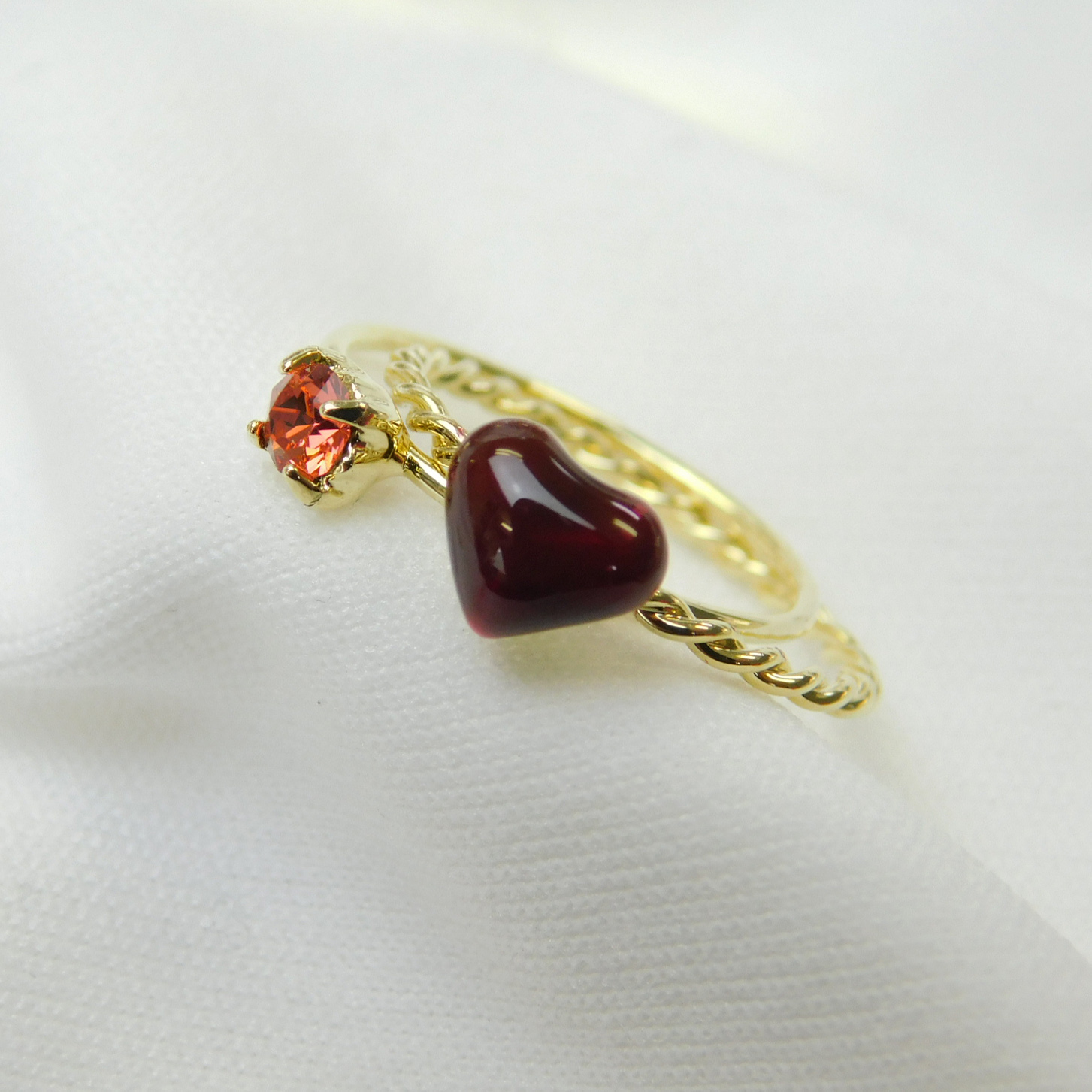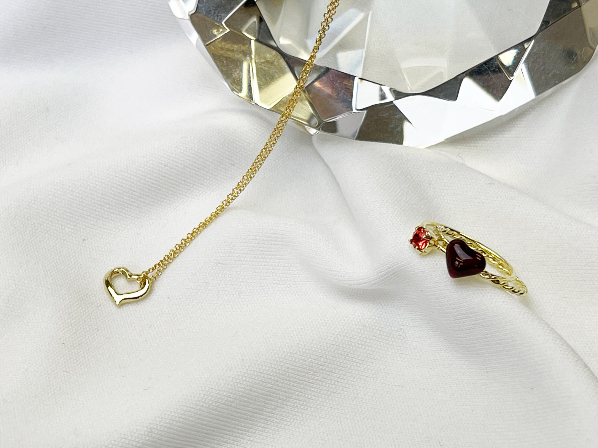 オープンハートのプチネックレスと、小振りでポッコリとしたレッドハートをモチーフにしたデザインリングをセットにしてお届けします。ポイントは同じハートのモチーフで合わせたデザイン。優しさと女子力をアップしていただけるコーディネートを是非お楽しみください。