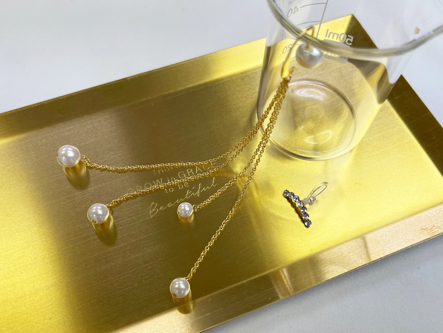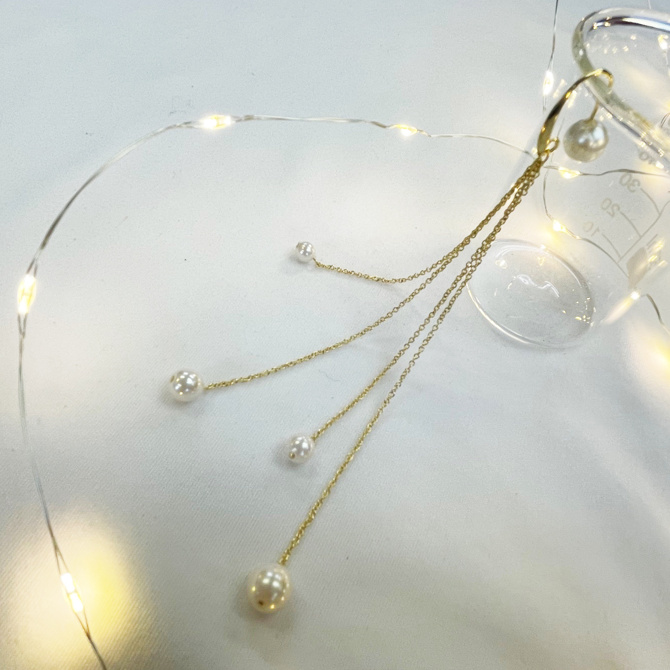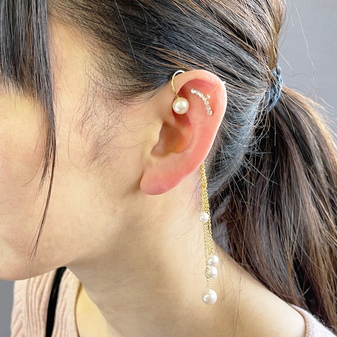 4連チェーンにパールを下げたロングデザインは、大人女子にぴったり。 耳の後ろから下がるロングチェーンが揺れ、上品なパールが映える洗練されたデザインです。