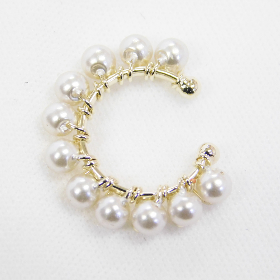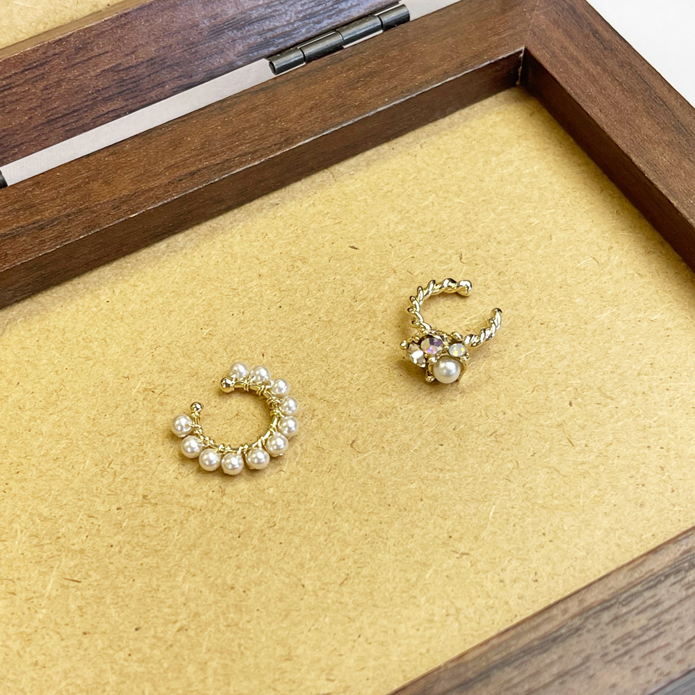 パールを使ったイヤーカフ2個セットです。耳にかけるだけの簡単装着で、ワンランク上のオシャレを楽しめるイヤーカフ。連なったパールが華やかなシンプルなデザインと、ビジューが煌めくゴージャスななデザインは、日常使いはもちろん、結婚式やパーティーシーンにぴったりです。