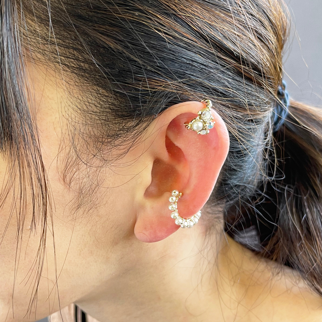 大口注文・法人のお問い合わせはこちらゴージャス×シンプルで華やかに!パールを使った異なるイメージが魅力の【ナツコ・グレース】のイヤーカフセットです。 シンプルなパールが上品で華やかなデザインと、ビジューが煌めくゴージャスなデザイン。 ピアスの穴は開いていないけど、耳元のおしゃれをもっと楽しみたい! イヤリングをつけたいけど、耳が痛くなるのが嫌…。 そんな方におすすめのイヤーカフ。耳にかけるだけの簡単装着で、ワンランク上のオシャレを楽しめます。