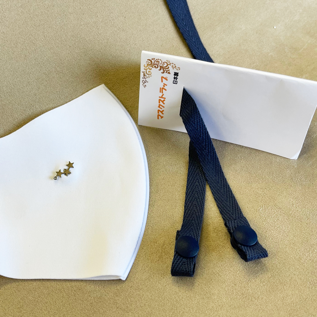 | 商品本体サイズ | ストラップ:長さ600mm×幅10mm×厚み1mm(全色共通) マスクピアス スマイル(シルバー・ゴールド)10mm×10mm×4mm 三ツ星(シルバー・ゴールド)15mm×9mm×4mm ハート 11mm×12mm×7mm 蝶 10mm×12mm×4mm |