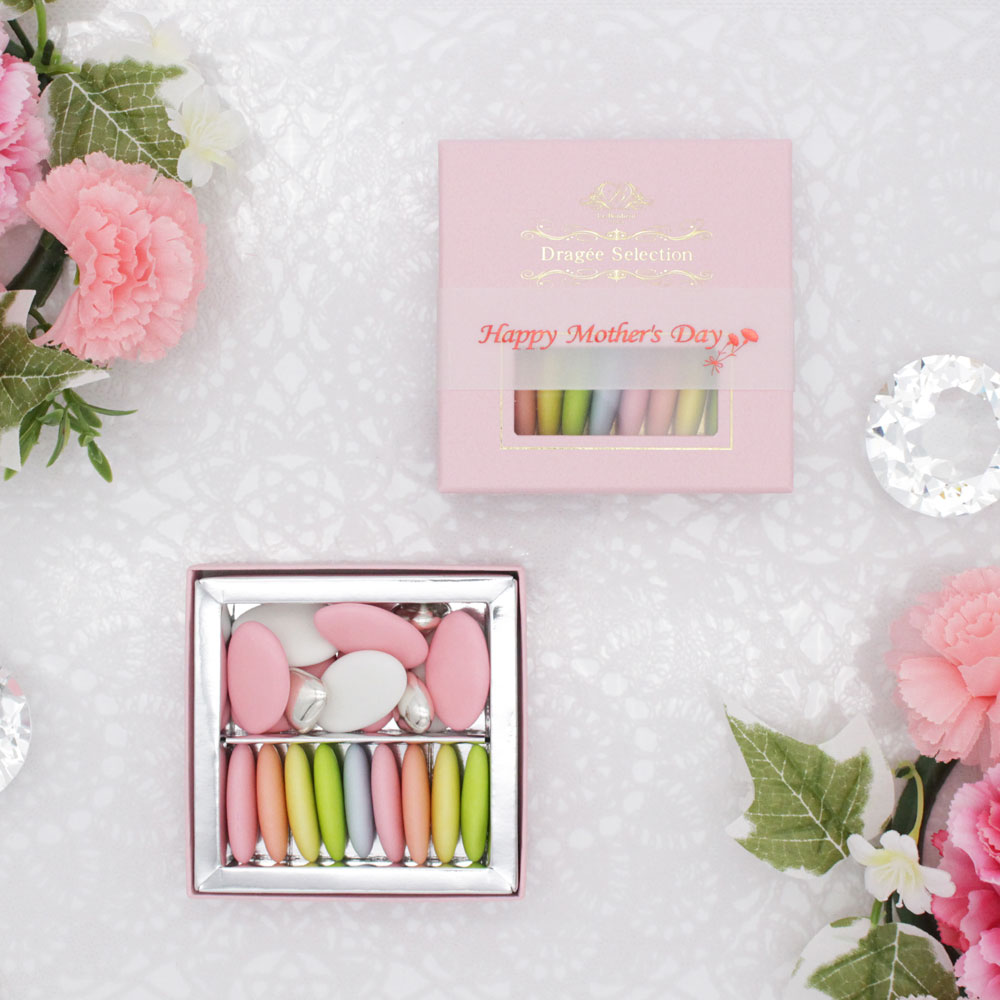フランス語で「幸福の種」という意味もある縁起物のチョコレート菓子"ドラジェ"。小窓からのぞくピンク系のドラジェは見た目にもキュート。母の日限定「Happy Mother's Day」 のメッセージ帯熨斗付きでお届けします。日頃の感謝を込めて、フランス伝統のスイーツはいかがですか?