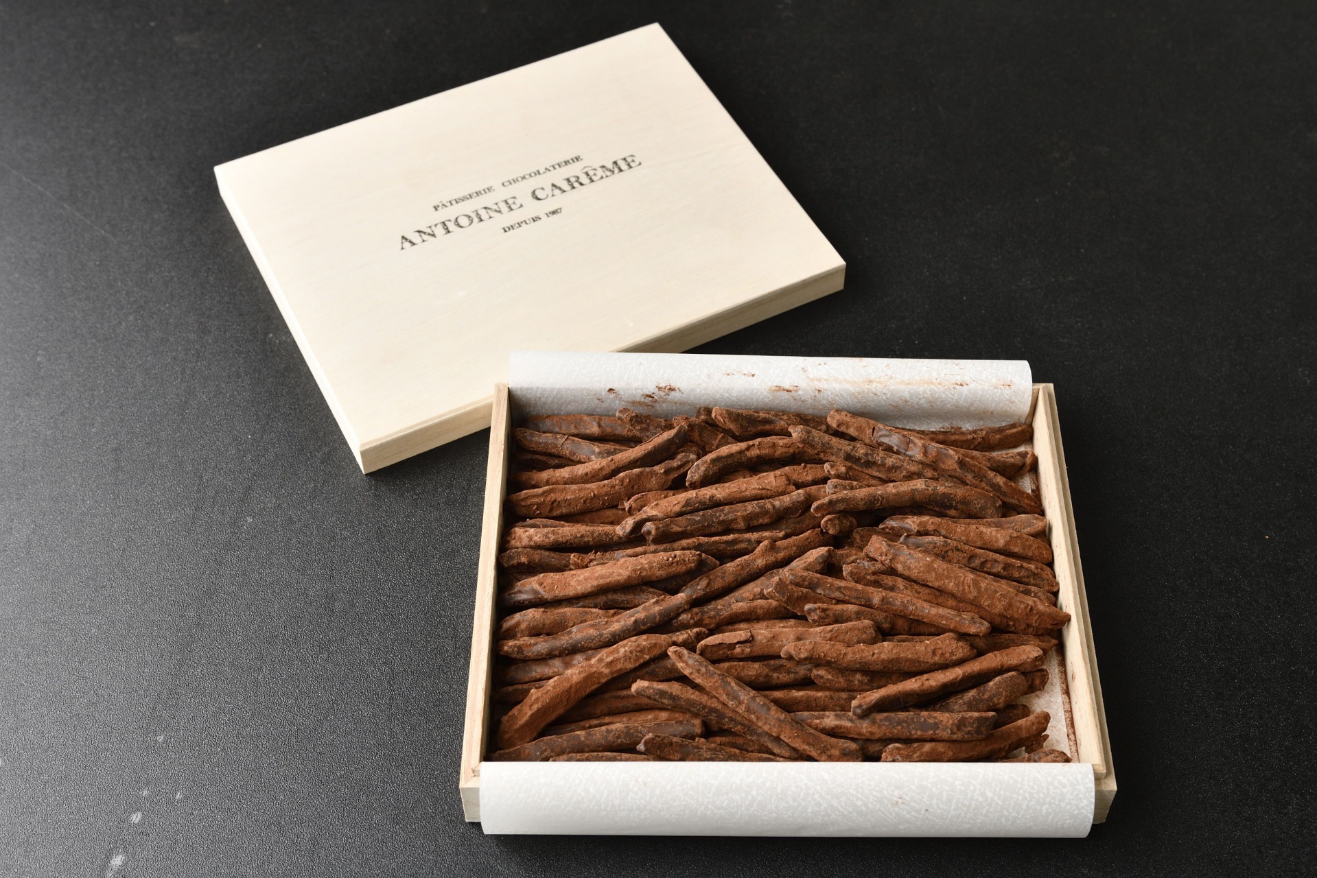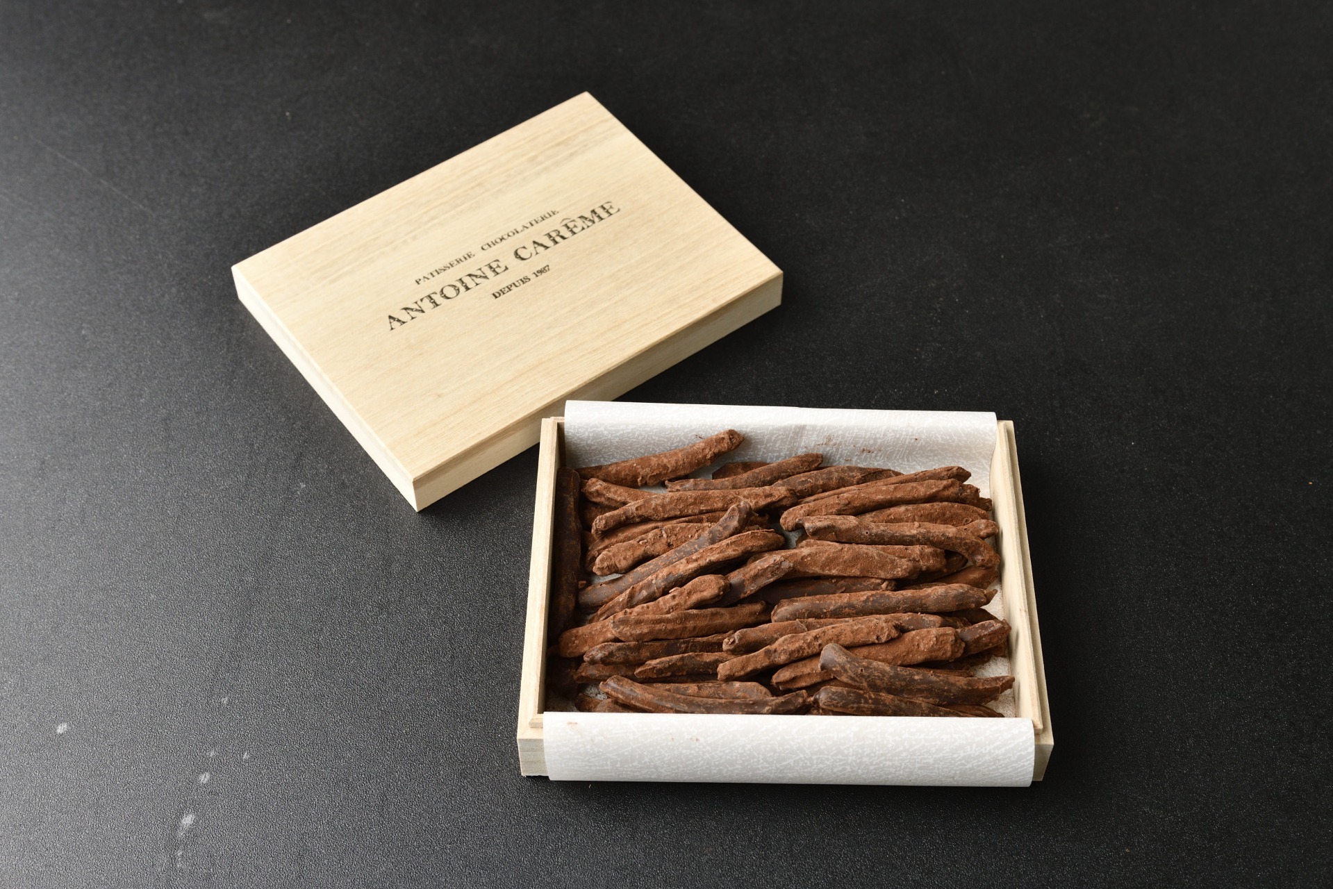オレンジの皮を10日間シロップで煮つめて、ゆっくりと糖分を浸みこませました。透明感のあるオレンジコンフィをスティック状に切り、1本ずつチョコレートコーティングしてココアをまぶしています。 オレンジのもつほろ苦さと洗練されたチョコレートの甘さのバランスは当店自慢の逸品です。上品な落ち着いたパッケージで、御贈答用におすすめです。