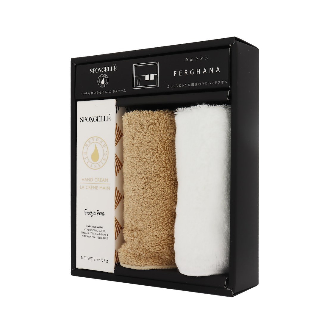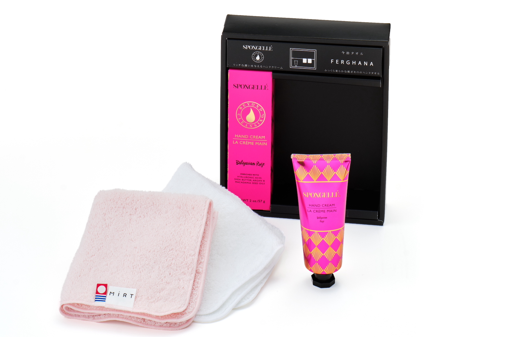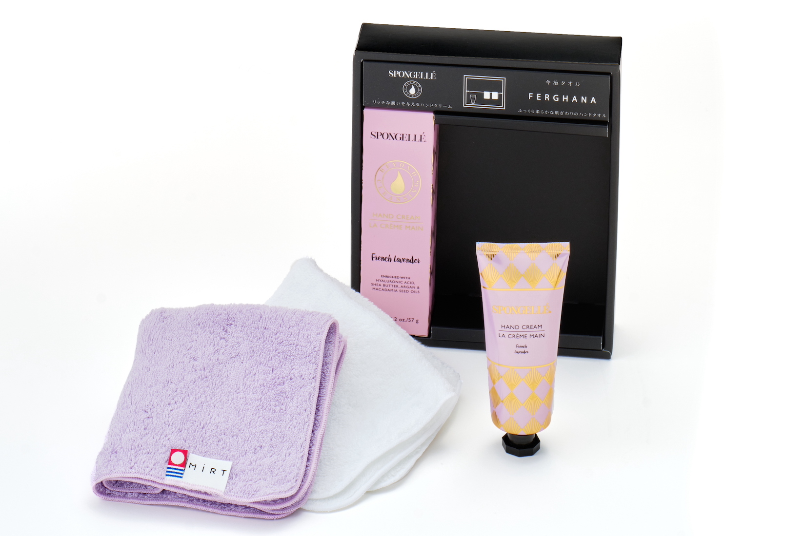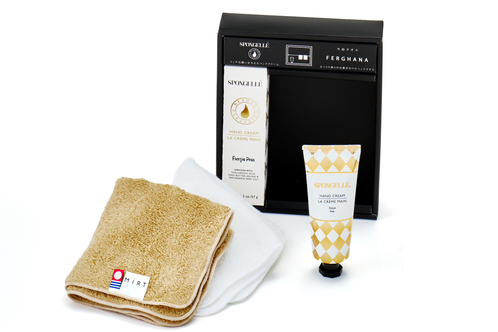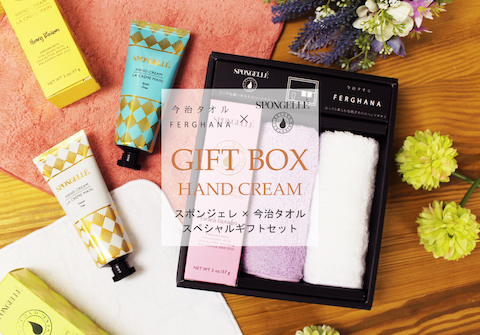 ”世界に誇る最高品質のタオル”120年の歴史を刻む、今治タオルのハンカチが「SPONGELLÉ」のハンドクリームとセットになって誕生しました。”フリージアペア”、”フレンチラベンダー”、”ブルガリアンローズ”の3種類の香りのギフトセットをご用意しました。「SPONGELLÉ」
