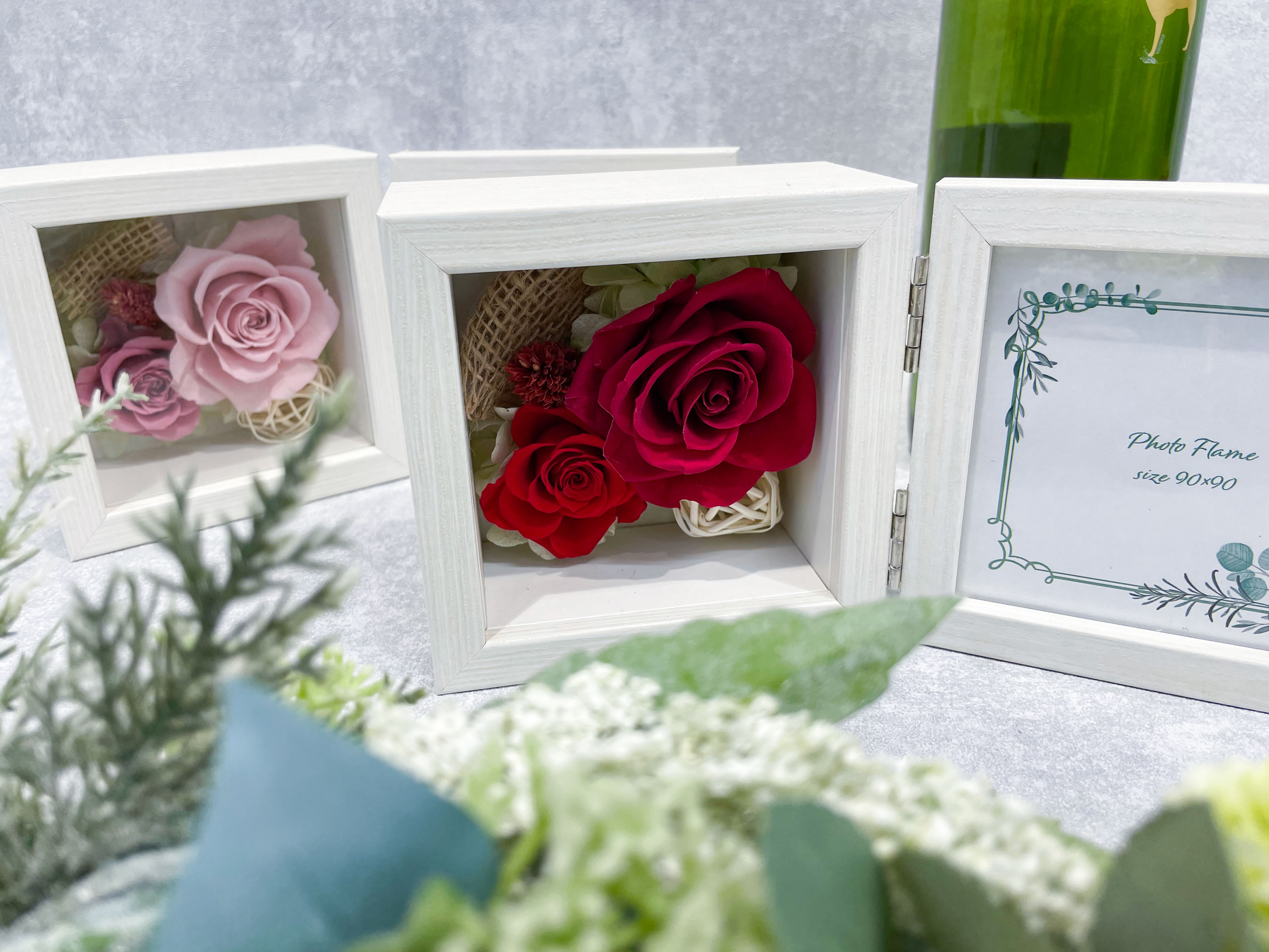 日頃の感謝の気持ちを、特別なフラワーギフトで伝えませんか?ナチュラルなフレームに大小のバラをメインに優しい雰囲気のアレンジに仕上げました。コンパクトサイズで置き場所を選ばず、写真も飾れます。ガラスでカバーされているためお花にホコリがかかる心配もありません。