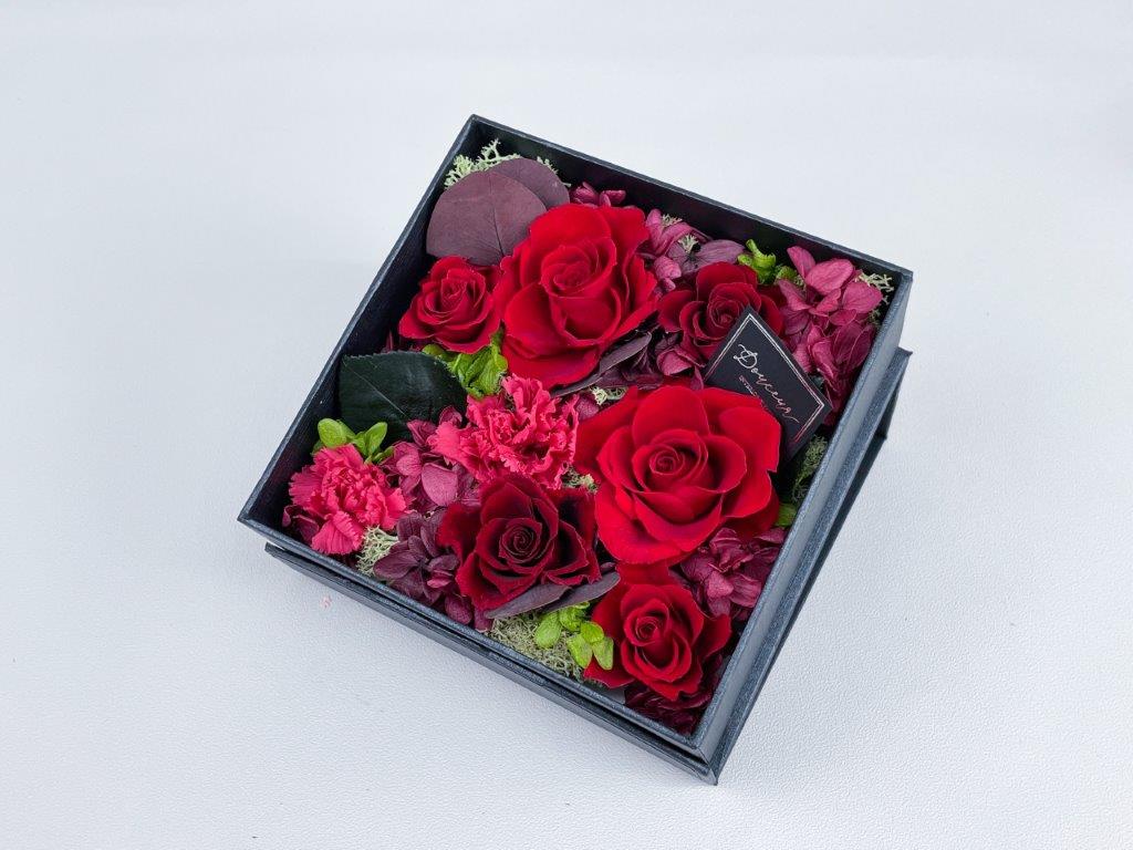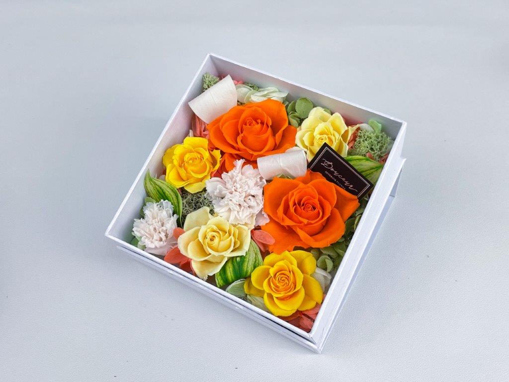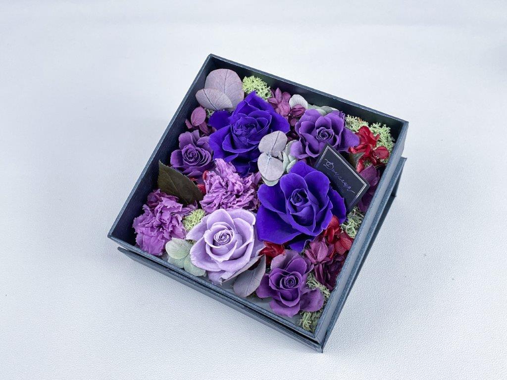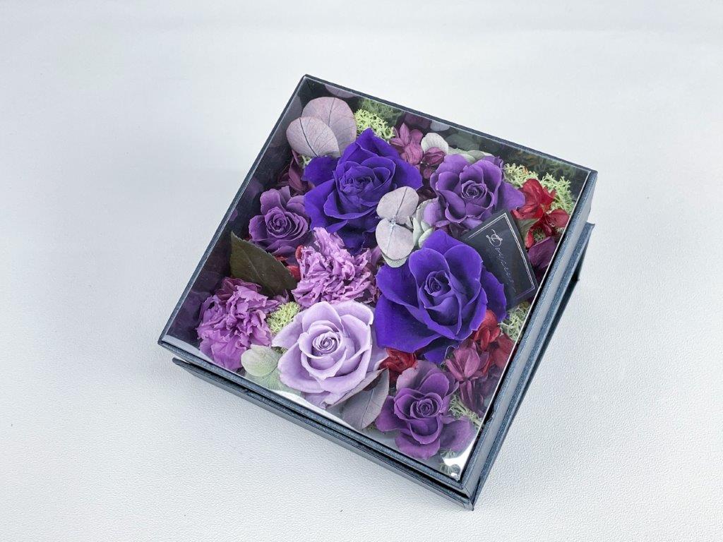 大口注文・法人のお問い合わせはこちらクロス調の高級感のあるボックス一面にフラワーアレンジをした商品です。ホワイトのボックスには柔らかく暖かみのあるアレンジ、ブラックのボックスには高級感のある上品なアレンジに仕上げました。