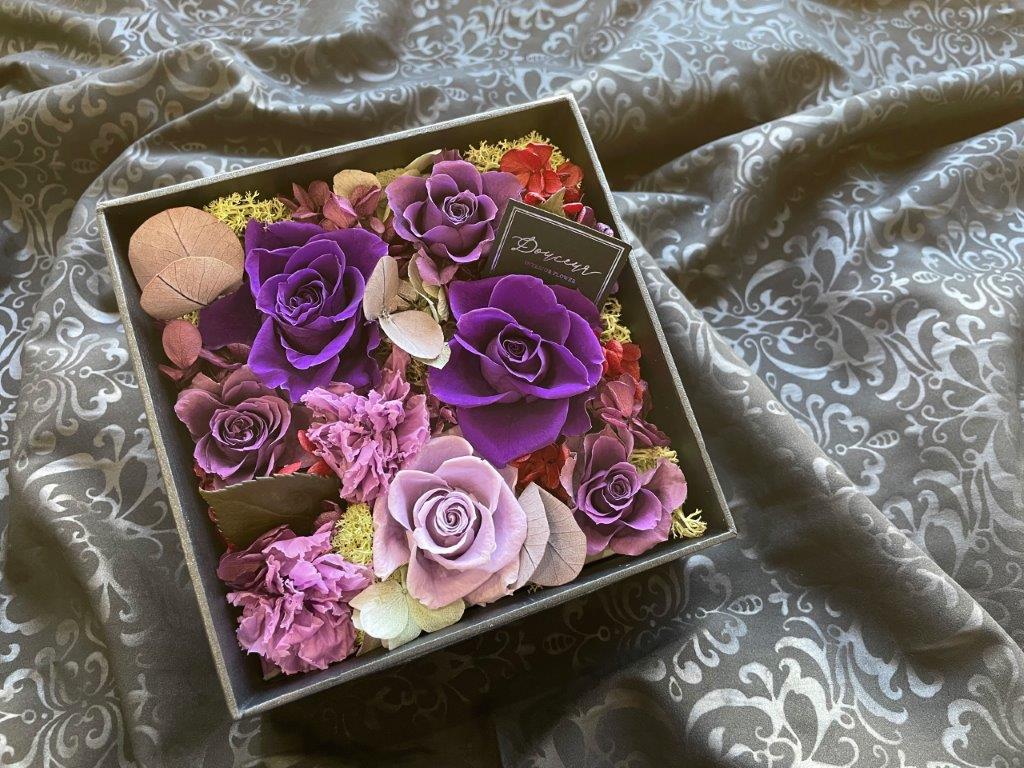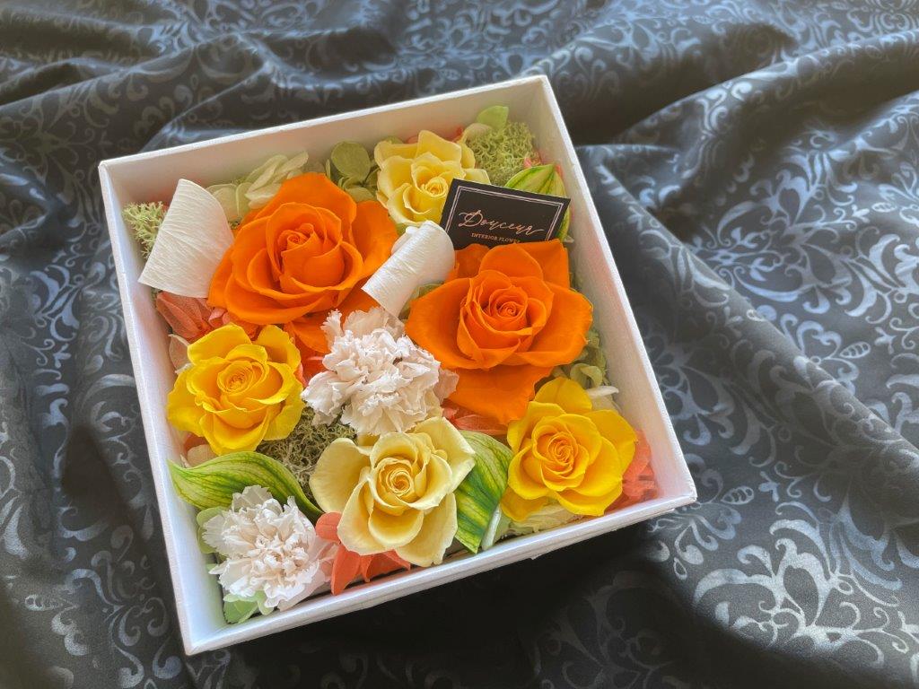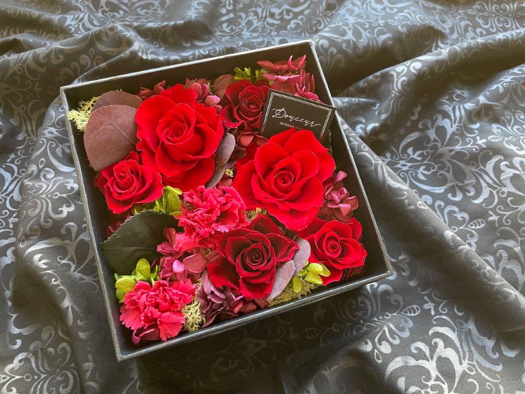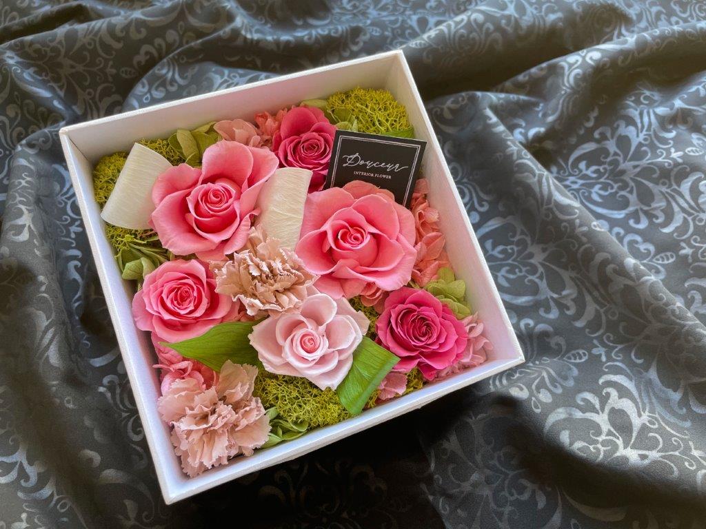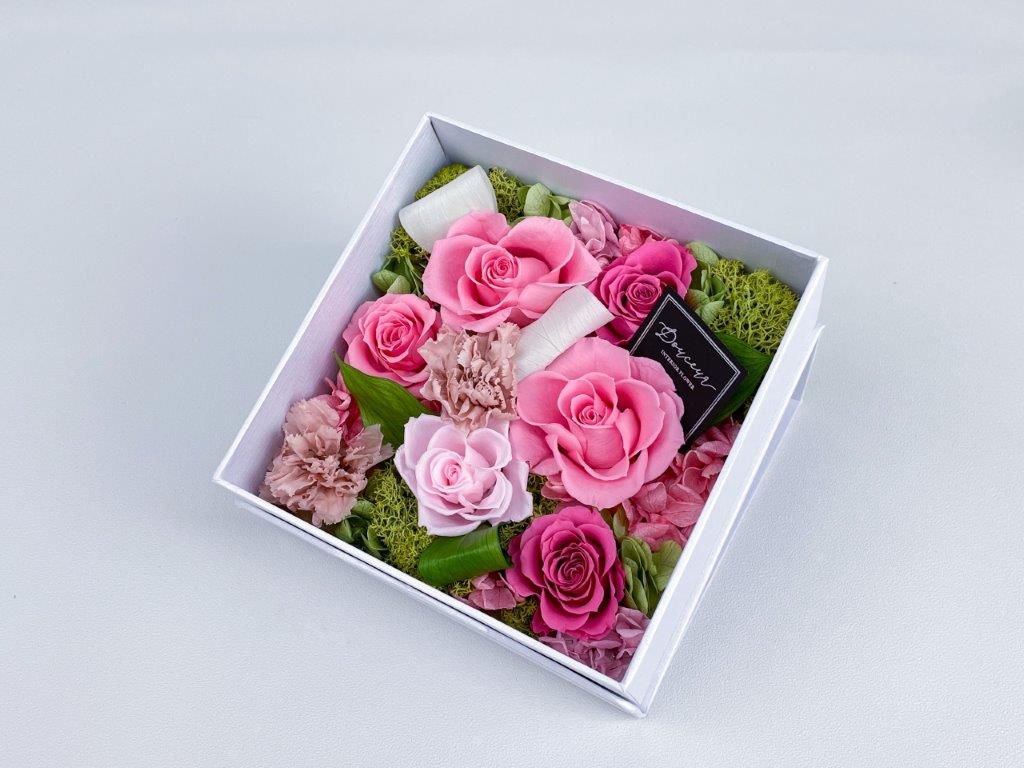大口注文・法人のお問い合わせはこちらクロス調の高級感のあるボックス一面にフラワーアレンジをした商品です。ホワイトのボックスには柔らかく暖かみのあるアレンジ、ブラックのボックスには高級感のある上品なアレンジに仕上げました。