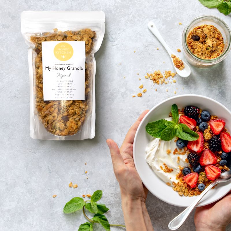 ヨーグルトにかけたり、サラダにかけたりしてお召し上がりください。血糖値を気にすることなく一度にたくさんの栄養を摂ることができる「MYHONEY」のグラノーラは、朝食にぴったりです。