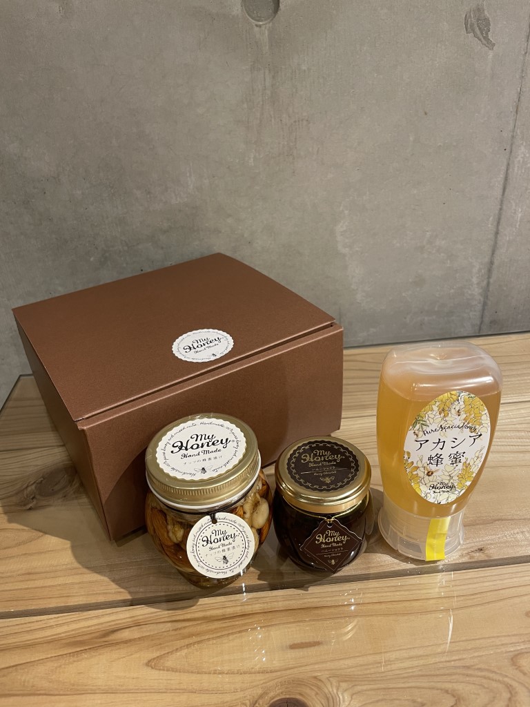 | 原材料 | 【ナッツの蜂蜜漬け】蜂蜜(ハンガリー産)、アーモンド、くるみ、カシューナッツ、マカダミアナッツ 【ハニーショコラ】蜂蜜(ハンガリー産)、ココアパウダー 【アカシアハニー】蜂蜜(ハンガリー産) |