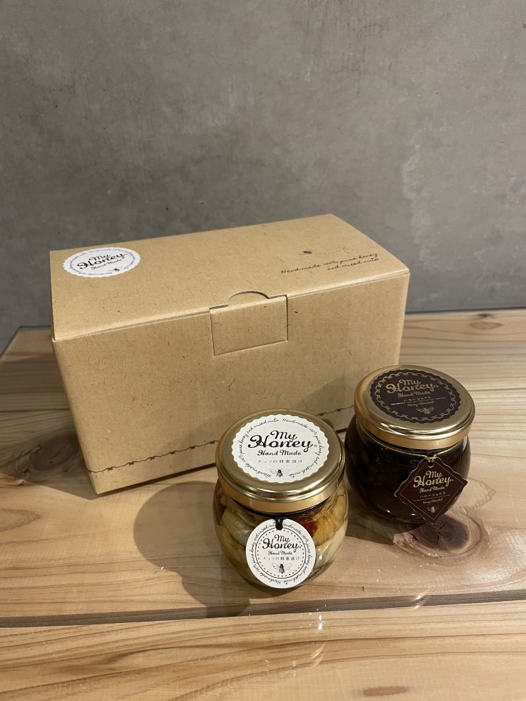 | 原材料 | 【ナッツの蜂蜜漬け】蜂蜜(ハンガリー産)、アーモンド、くるみ、カシューナッツ、マカダミアナッツ 【ハニーショコラ】蜂蜜(ハンガリー産)、ココアパウダー |