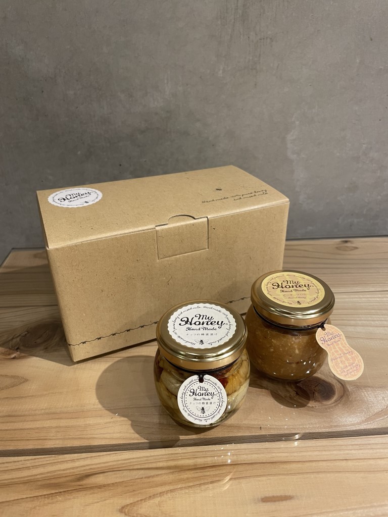 大口注文・法人のお問い合わせはこちら「MY HONEY」のナッツの蜂蜜漬けと、砂糖・乳製品・添加物を一切使用せず、蜂蜜とピーナッツだけで作られたピーナッツペーストの2つを詰め合わせたギフトセットです。
