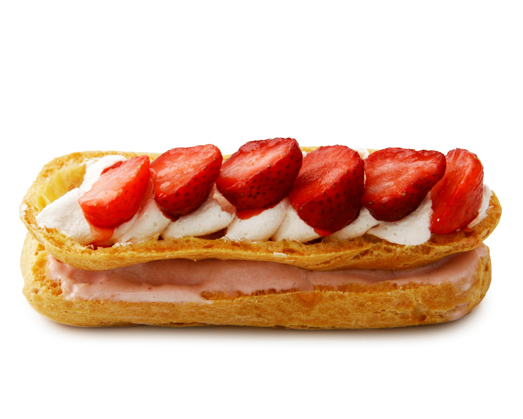 甘酸っぱい苺アイスクリームにストロベリークリームを重ね、苺の果肉をトッピングした、苺づくしのシューアイスです。