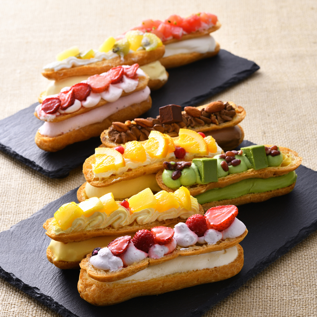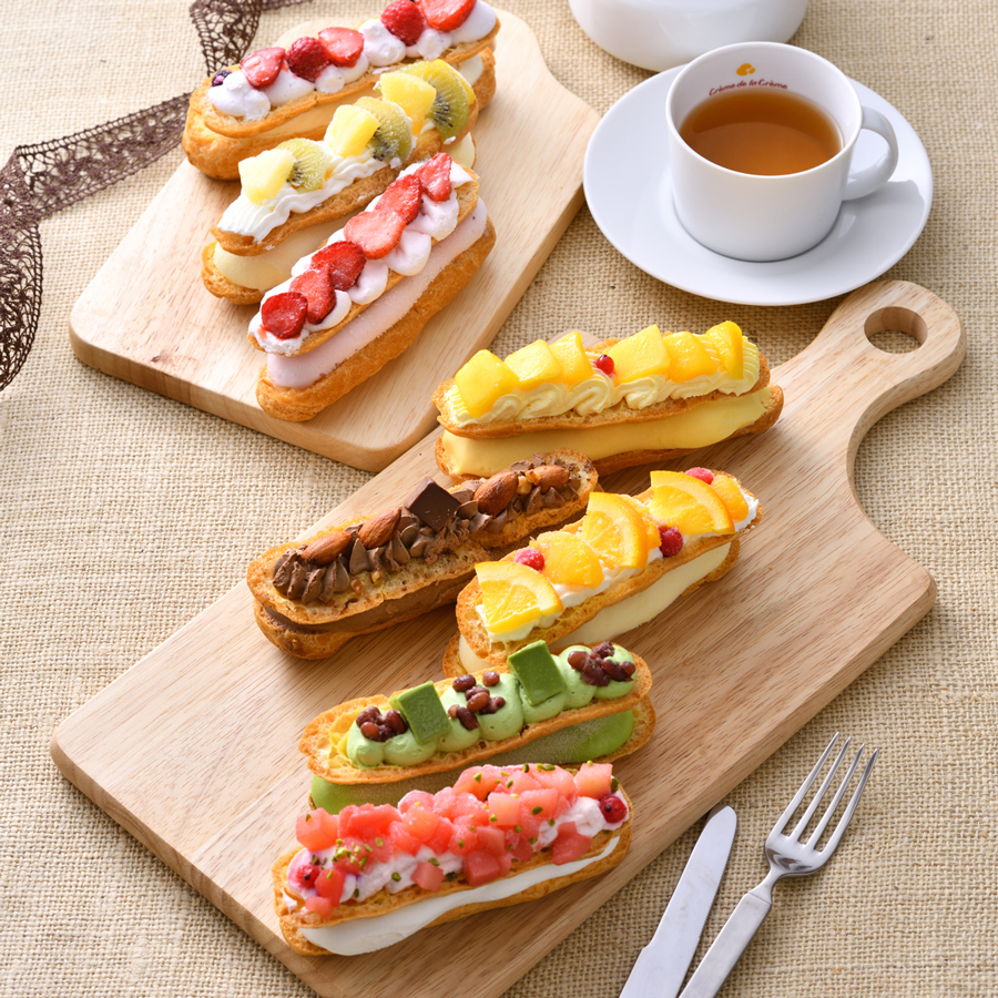 | 原材料 | 【ショコラ&アーモンド】シュー皮(国内製造)、チョコレート、乳等を主要原料とする食品、脱脂濃縮乳、クリーム、アーモンド加工品、砂糖、卵黄、ココア/乳化剤、トレハロース、安定剤(増粘多糖類)、香料、カゼインNa、着色料(カラメル、カカオ、アナトー)、pH 調整剤、酸化防止剤(V.E)、(一部に小麦・乳成分・卵・大豆・リンゴ・アーモンドを含む) 【ミックスベリー】シュー皮(国内製造)、イチゴ、クリーム、脱脂濃縮乳、乳等を主要原料とする食品、砂糖、ラズベリー、卵黄、ブルーベリー、ブルーベリーペースト/乳化剤、香料、トレハロース、糊料( 増粘多糖類、メタリン酸Na)、着色料(アカキャベツ、アナトー)、酸味料、酸化防止剤(V.E)、(一部に小麦・乳成分・卵・大豆・リンゴを含む) 【ストロベリー】イチゴ(中国産)、シュー皮、乳等を主要原料とする食品、脱脂濃縮乳、クリーム、砂糖、卵黄、ストロベリーペースト/トレハロース、乳化剤、安定剤(増粘多糖類、メタリン酸Na)、香料、着色料(アカビート、紅麹、クチナシ、アナトー)、酸味料、酸化防止剤(V.E)、(一部に小麦・乳成分・卵・大豆・リンゴを含む) 【オレンジ】オレンジ果汁(オレンジ(ブラジル産))、オレンジ、シュー皮、乳等を主要原料とする食品、クリーム、砂糖、水あめ、脱脂粉乳、赤スグリ、オレンジペースト/乳化剤、トレハロース、糊料(増粘多糖類、メタリン酸Na)、香料、酸味料、塩化Ca、酸化防止剤(V.E)、着色料(アナトー)、(一部に小麦・乳成分・卵・大豆・リンゴ・オレンジを含む) 【ピーチ】もも(中国産)、シュー皮、乳等を主要原料とする食品、砂糖、クリーム、水あめ、脱脂粉乳、赤スグリ、洋酒、ピーチペースト、ピスタチオ/乳化剤、トレハロース、糊料(増粘多糖類、メタリン酸Na)、香料、着色料(紅麹、アナトー)、酸味料、酸化防止剤(V.C、V.E)、(一部に小麦・乳成分・卵・大豆・リンゴ・ももを含む) 【トロピカルフルーツ】シュー皮(国内製造)、乳等を主要原料とする食品、砂糖、フルーツピューレ(パイナップル、マンゴー、パッションフルーツ、ライム)、マンゴー、キウイフルーツ、クリーム、パイナップル、水あめ、脱脂粉乳/乳化剤、トレハロース、安定剤(増粘多糖類、メタリン酸Na)、乳酸Ca、着色料(紅花黄、クチナシ、アナトー)、酸味料、酸化防止剤(V.C、V.E)、香料、(一部に小麦・乳成分・卵・大豆・りんご・キウイフルーツを含む) 【抹茶&小豆】シュー皮(国内製造)、クリーム、脱脂濃縮乳、乳等を主要原料とする食品、砂糖、チョコレート、小豆甘納豆、卵黄、抹茶/乳化剤、トレハロース、安定剤( 増粘多糖類、メタリン酸Na)、香料、着色料(アナトー)、酸化防止剤(V.E)、(一部に小麦・乳成分・卵・大豆・リンゴを含む) 【マンゴー】マンゴー(メキシコ産、インド産)、シュー皮、乳等を主要原料とする食品、クリーム、砂糖、脱脂粉乳、赤スグリ、マンゴーペースト/トレハロース、乳化剤、安定剤(増粘多糖類、メタリン酸Na)、香料、着色料(クチナシ、カロチン、アナトー)、酸味料、酸化防止剤(V.E)、(一部に小麦・乳成分・卵・大豆・リンゴを含む) |