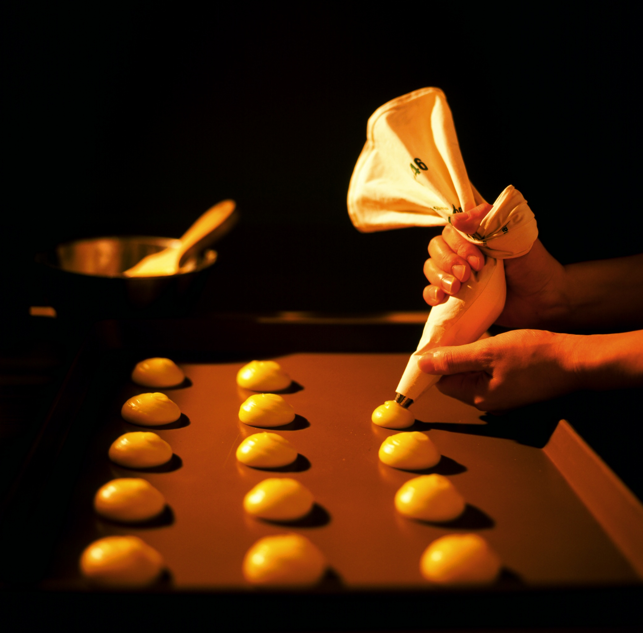 同時工程で仕上げると、このお菓子のケーキ部分とシュー部分が焼いた際の膨らみにより剥がれてしまいます。そのため、まずはシュー部分だけを焼き上げ、その後ケーキ部分にシューを重ねて再度焼成していきます。 オーブンで焼いている際は、シューが剥がれないよう、少し焼いた後、窯から出し上から抑える、という工程を繰り返し、最後にガナッシュクリームを注入し仕上げます。何工程にも分かれた手間がかかる製法により、他にはない当店だけのオリジナルの焼菓子スイーツが誕生しました。