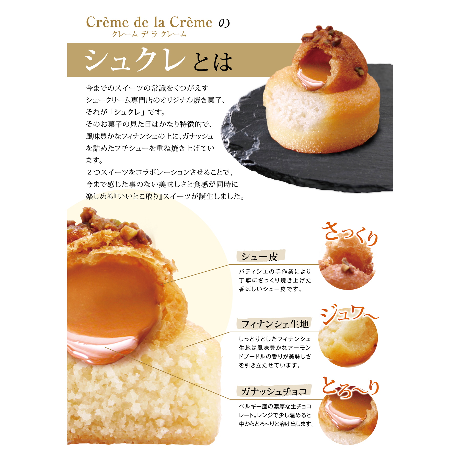 大口注文・法人のお問い合わせはこちらしっとりジェノワーズにガナッシュの入ったプチシューをトッピングしました。シュークリーム専門店ならではの焼菓子スイーツとはどんなものか?その思いを実現したのが、このプチシューとジェノワーズを重ね合わせた独創的な見た目のお菓子です。 とろ~りとしたガナッシュクリームたっぷりのシューとふんわりやさしいジェノワーズのおいしさのコラボレーションから生まれました。新しい個性豊かな2つの「甘い味わい」を一緒にお楽しみいただける”よくばり”スイーツです。ガーリーでオシャレなパッケージデザインも!ふと笑顔がこぼれてしまう、そんな甘くて美味しいシュクレを大切な方に贈りませんか?
