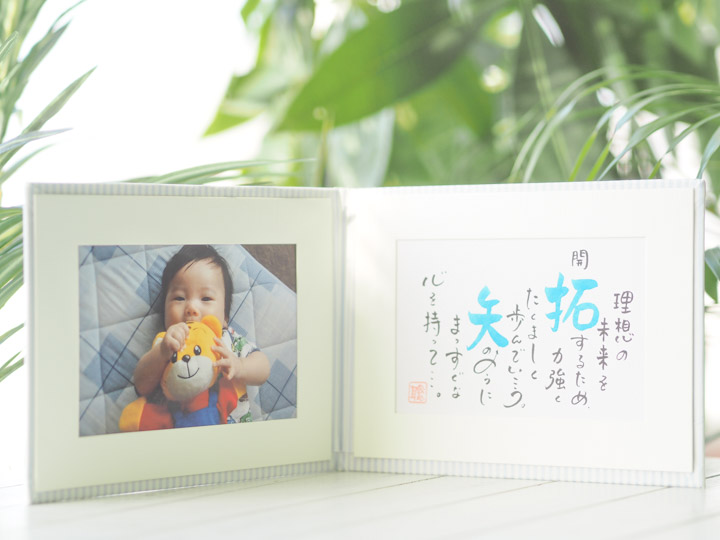 出産祝いやお子さま誕生の記念に。希望に満ちた未来へと歩んでいけるよう、一文字ずつ手書きで思いを込めて書き上げます。表紙には赤ちゃんの出生身長・体重・名前・誕生日が入るプレートが飾られ、一生の記念に。赤ちゃんご誕生の喜びがいっぱいの可愛らしいアルバムです。