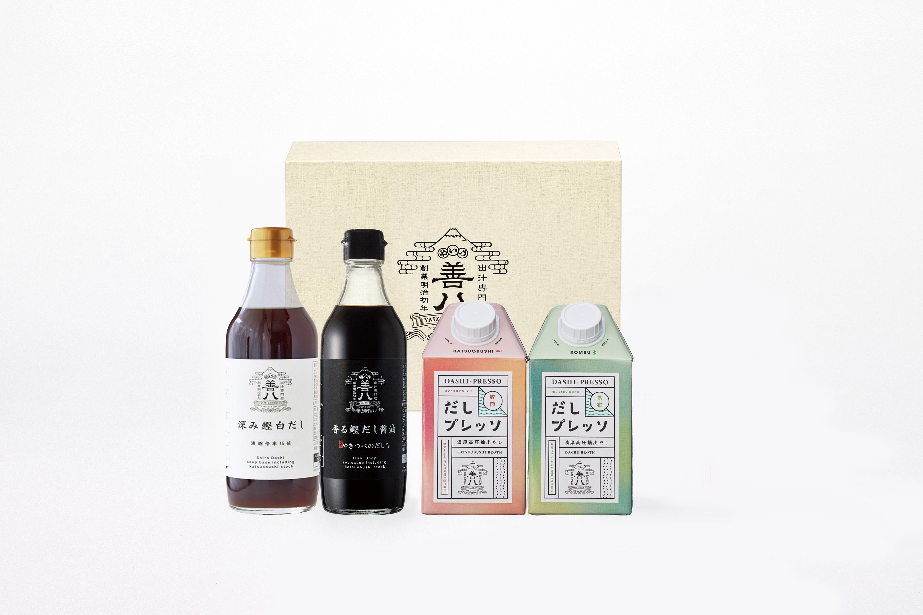 大口注文・法人のお問い合わせはこちら「やいづ善八(ヤイヅゼンパチ)」の、だしプレッソ(鰹節、昆布)、香る鰹だし醤油、深み鰹白だしを詰め合わせました。
