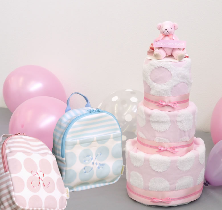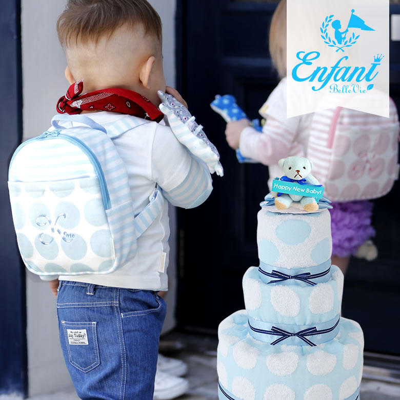 大口注文・法人のお問い合わせはこちらベルビーべべのあたたかみのある上品なタオルを使ったおむつケーキと、名入れもイニシャルをモチーフにして生地に合わせた2色の糸でおしゃれに仕上げたベビーリュックがとってもキュート! ベビーリュックにはベビーのお名前をオシャレに刺繍して思い出の残る一品に。華やかなおむつケーキと一緒に贈る実用的でオシャレな特別セットです。