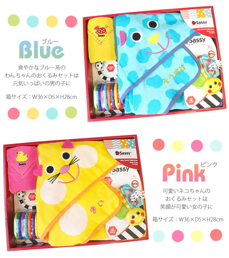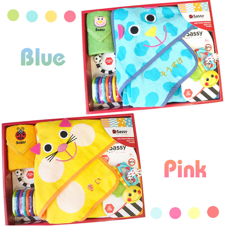 全世界の赤ちゃんに愛され続ける「Sassy」から、おくるみセットが登場しました。おくるみ、タオル、歯固め、リングのおもちゃがセットになっています。おくるみにはアニマルデザインのフードが付いて様々なシーンで活躍します。名入れ刺繍をしてオリジナルギフトにおすすめ!