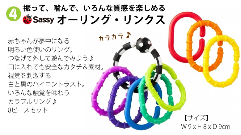 赤ちゃんが夢中になる色使いのリングです。つなげて、外して遊んでみよう!口に入れても安全なカタチ&素材で、視覚を刺激する白と黒のコントラストが特徴です。色んな触感を味わうカラフルリングは8ピースセットです。