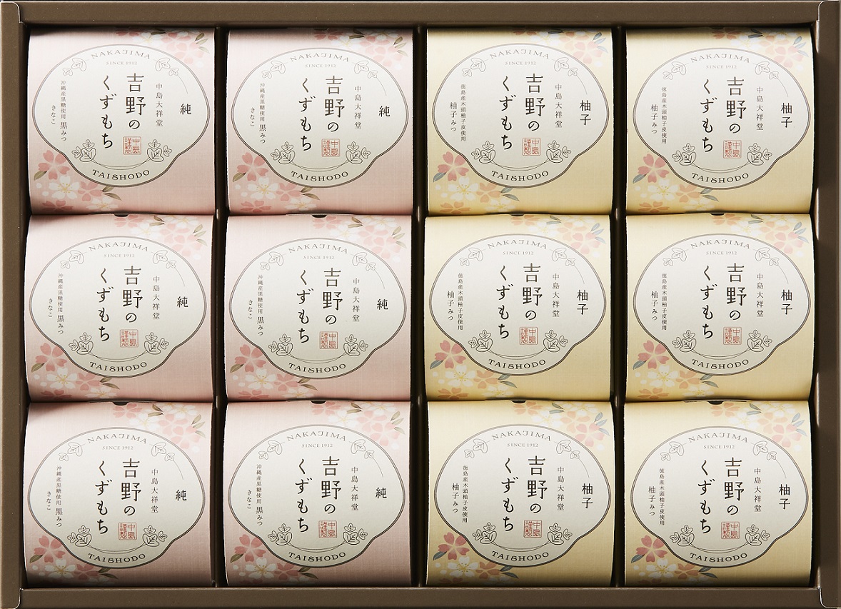 | 原材料 | <純> 【くずもち】還元水飴(国内製造)、砂糖(国内製造)、餅粉、本葛粉/ゲル化剤(増粘多糖類、加工デンプン) 【きな粉】大豆、砂糖【黒みつ】水あめ、黒糖(沖縄県産)、グラニュー糖 <柚子> 【くずもち】還元水飴(国内製造)、砂糖(国内製造)、柚子皮砂糖漬、餅粉、本葛粉、柚子抽出物/ゲル化剤(加工デンプン、増粘多糖類)、pH調整剤、香料、紅花色素 【柚子みつ】水あめ、砂糖、蜂蜜、柚子果汁、柚子皮、食塩/酸味料、増粘多糖類、酸化防止剤(V.C)、クチナシ色素 |
