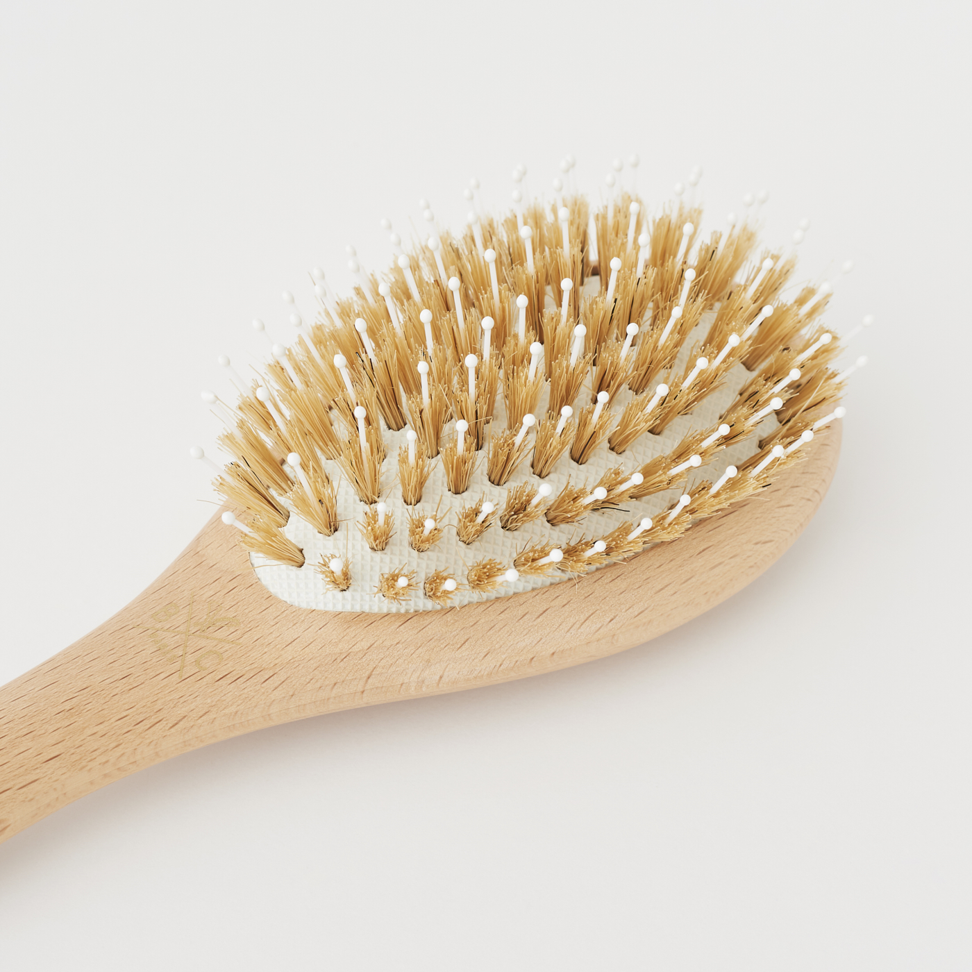 猪毛とナイロンピンのコンビネーションブラシ。 油分と水分がたっぷり含まれる猪毛は、とかすたびに髪に潤いと艶を与え、サラサラの美しい髪へ導きます。柔軟性のあるナイロンピンは、髪の絡まりをほぐしながら同時に頭皮をやさしくマッサージします。また静電気も軽減し、髪にまとまりを与えます。