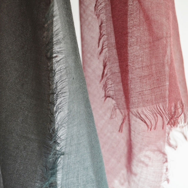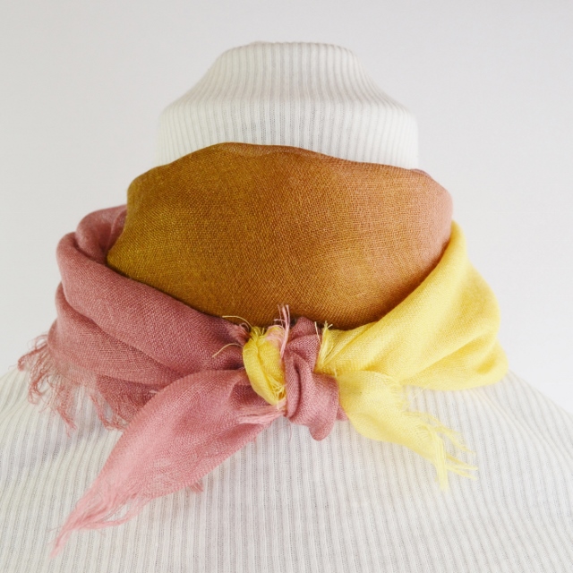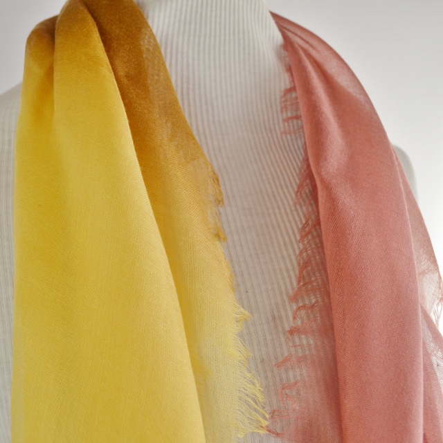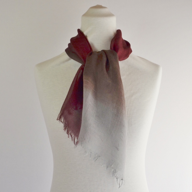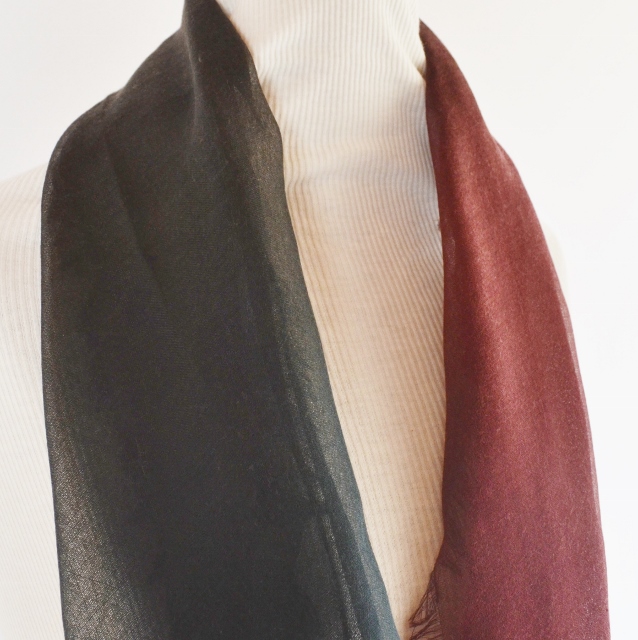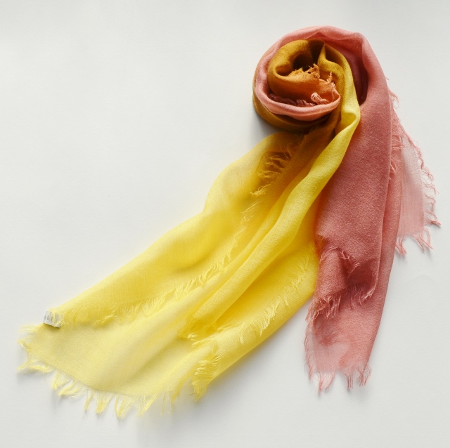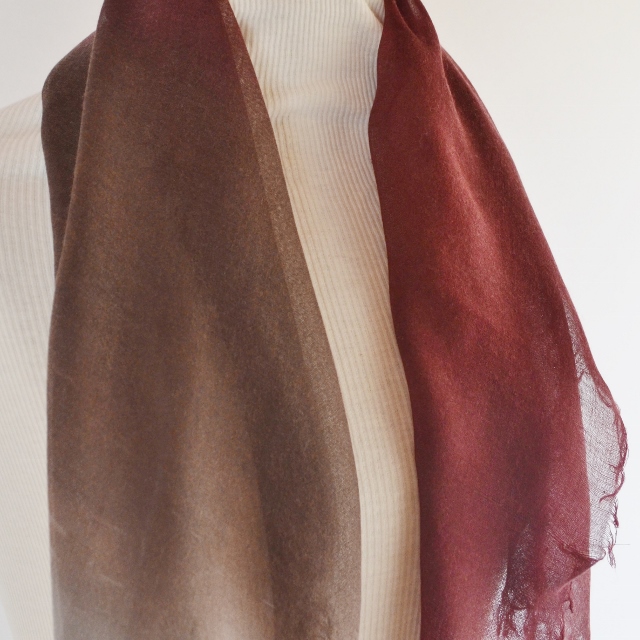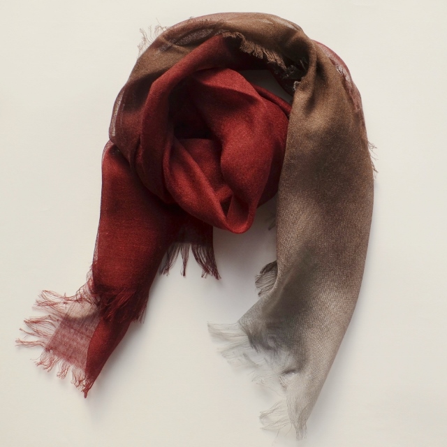 上質のシルクとウールを混ぜた糸で織った小振りのスカーフです。重さはたったの13g。身に付けているのを忘れてしまいます。職人の手で一枚ずつ丁寧にぼかし染めが施してあり、柔らかな雰囲気を醸し出します。極上の柔らかさと暖かさをお楽しみ下さい。