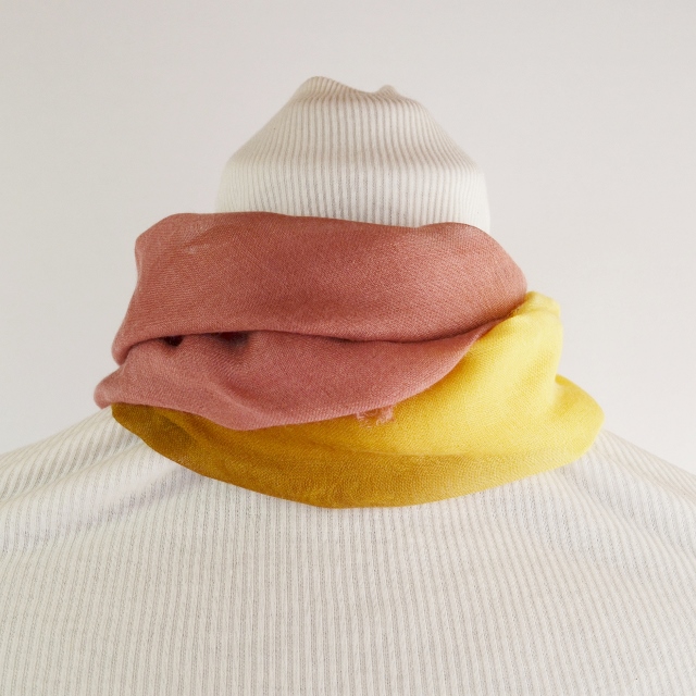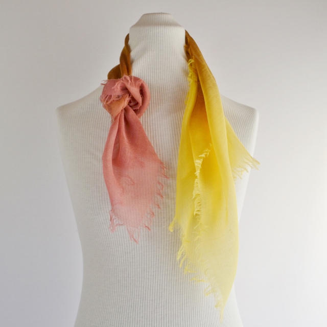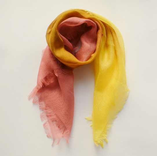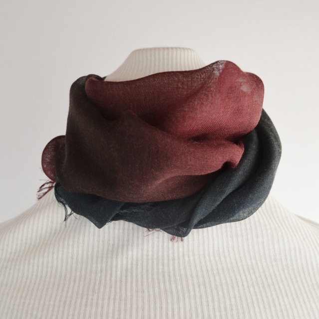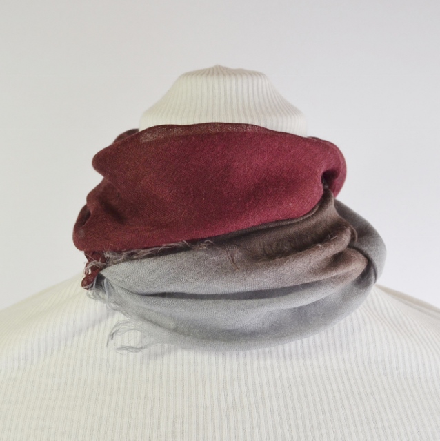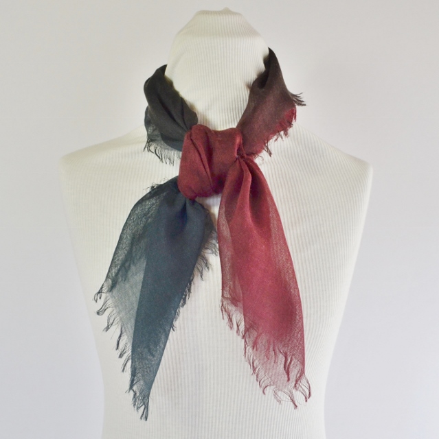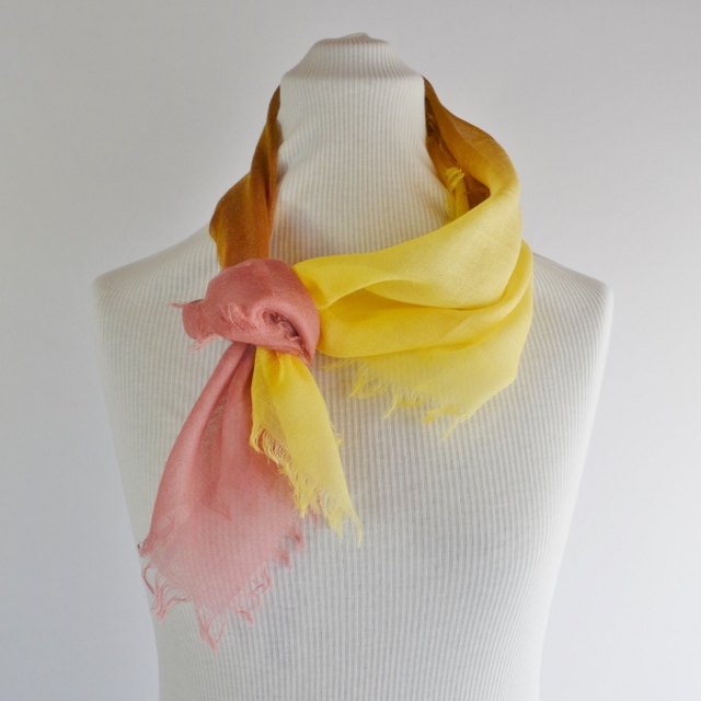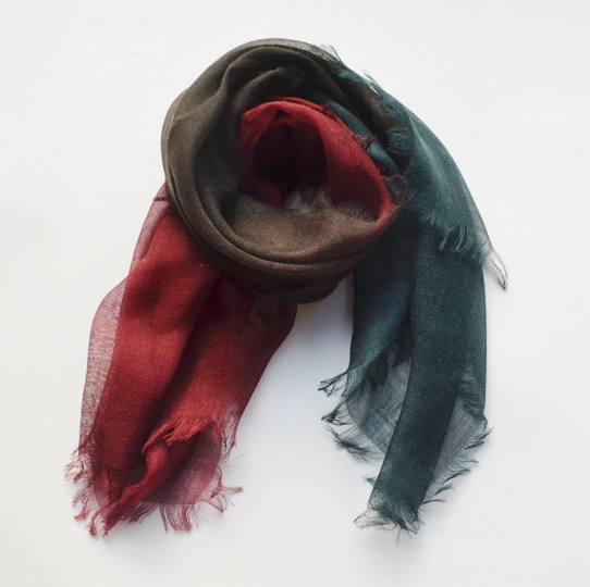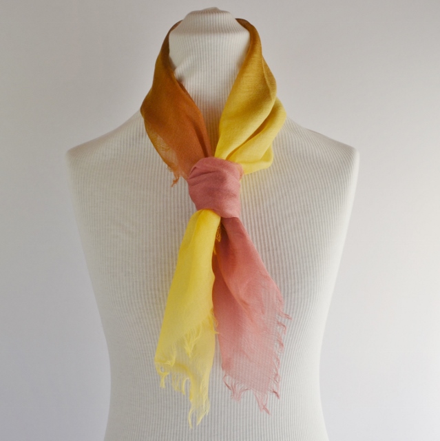 上質のシルクとウールを混ぜた糸で織った小振りのスカーフです。重さはたったの13g。身に付けているのを忘れてしまいます。職人の手で一枚ずつ丁寧にぼかし染めが施してあり、柔らかな雰囲気を醸し出します。極上の柔らかさと暖かさをお楽しみ下さい。