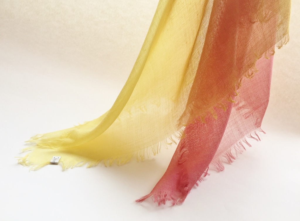 大口注文・法人のお問い合わせはこちら髪の毛より細い糸で織った極薄のガーゼの生地に、 職人が一枚ずつ手作業でぼかし染めを施しました。 繊細な色の移り変わりに目を奪われます。