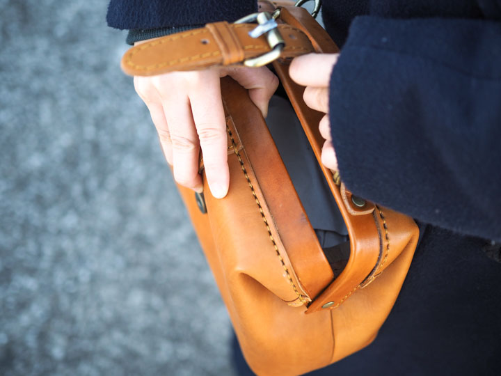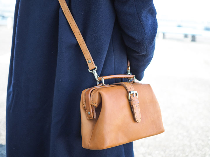 天然牛革を使用したショルダーバッグです。上部が口枠になっていて口が大きく開くので、物の出し入れもしやすく便利です。天然牛革が醸すレトロな雰囲気やゴールドの金具で高級感のある仕上がりになっています。デザイン性のあるバッグでお出かけに最適なバックです。